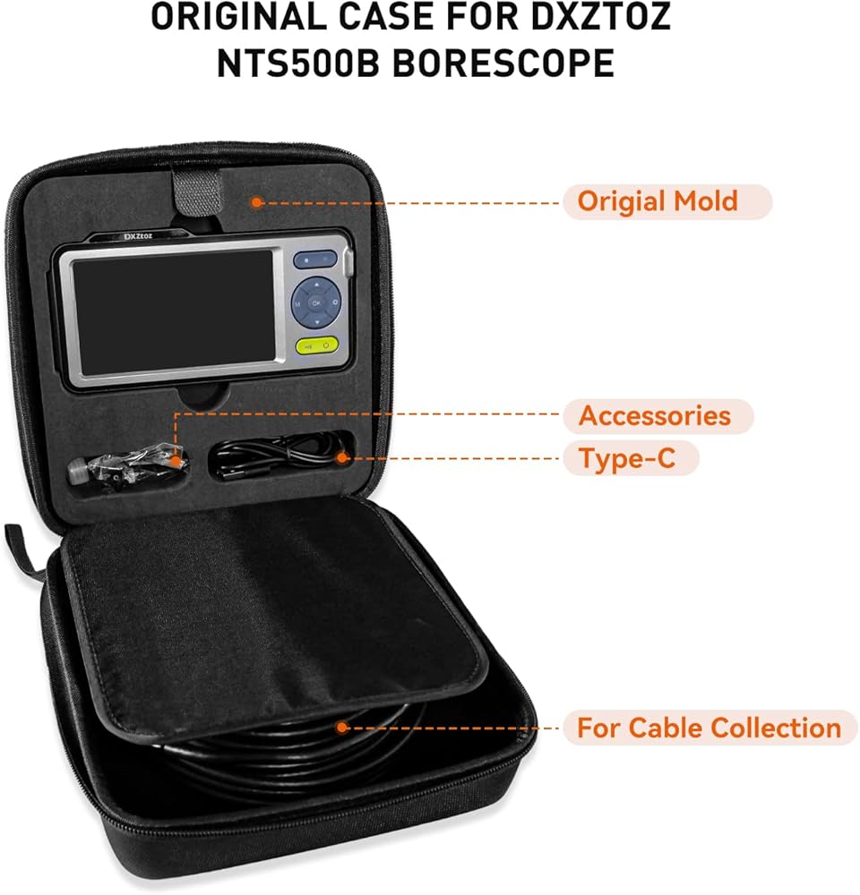 【Hard Shell Protective Case】 Originally and delicately designed portable carrying case for borescopes by DXZtoz NTS500B. Matching module well fit every parts, and additional shell pad protects from falling out, all items well organized.