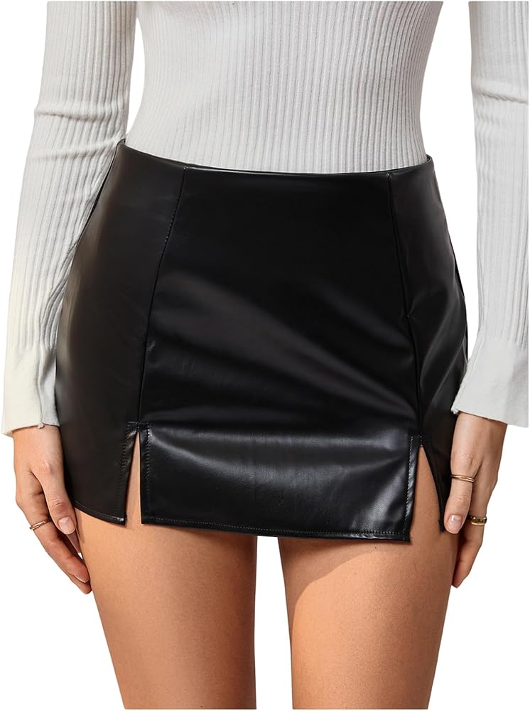 • Features: Low rise, double split hem, zip up, pu leather, a line mini skirt