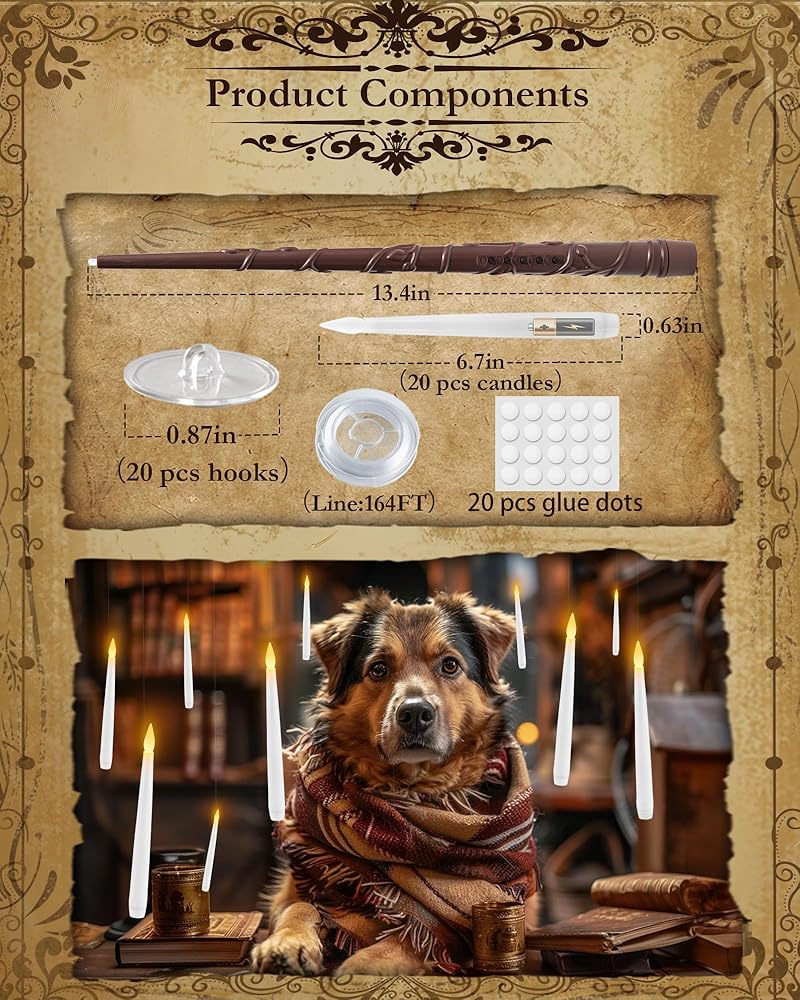 إذن ماذا يوجد في الصندوق؟ 20 شمعة مستدقة عديمة اللهب (تتطلب كل منها بطارية AAA واحدة، غير متضمنة)، والتي يمكن أن تجعل الغرفة متوسطة الحجم تبدو رائعة جدًا. 20 خطافًا للسقف المستوي أو أي سطح مستوٍ آخر، يتم استخدام خط صيد بطول 164 قدمًا لتعليق الشموع السحرية، وعصا سحرية للتحكم عن بعد في الشمعدانات عديمة اللهب. تم إعداد الحزمة بأكملها بشكل جيد، حيث يتم وضع الشموع وجهاز التحكم عن بعد في صينية مصبوبة مما يجعلها خالية من التلف في الصندوق.