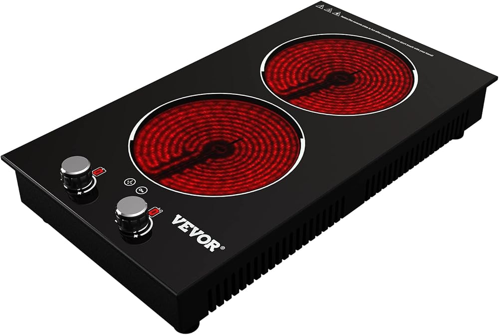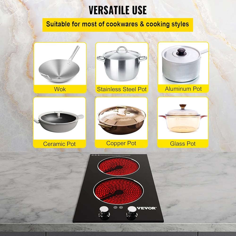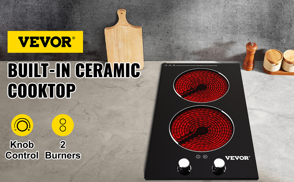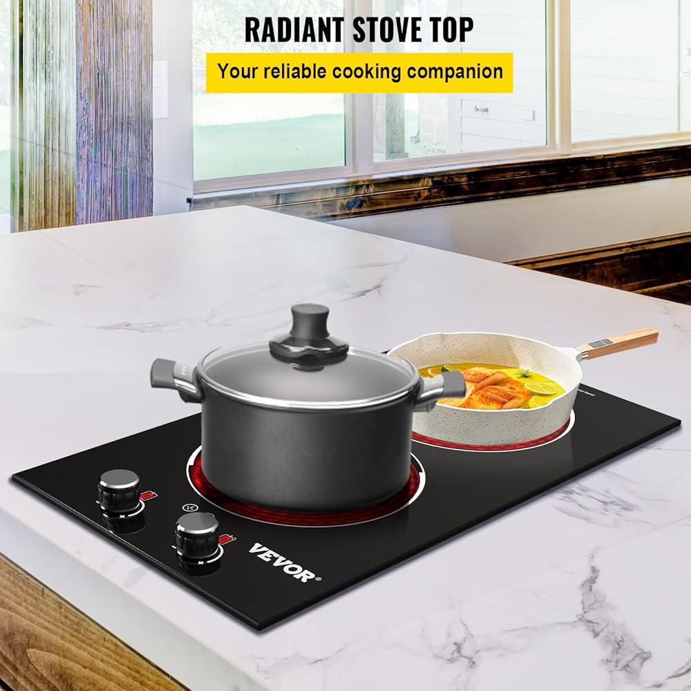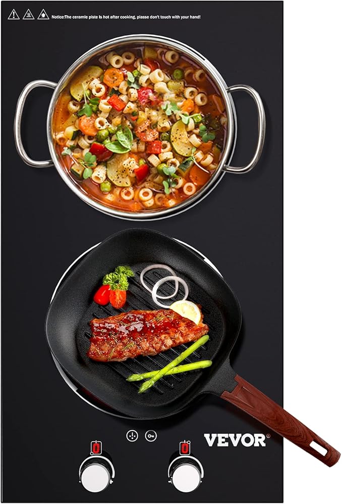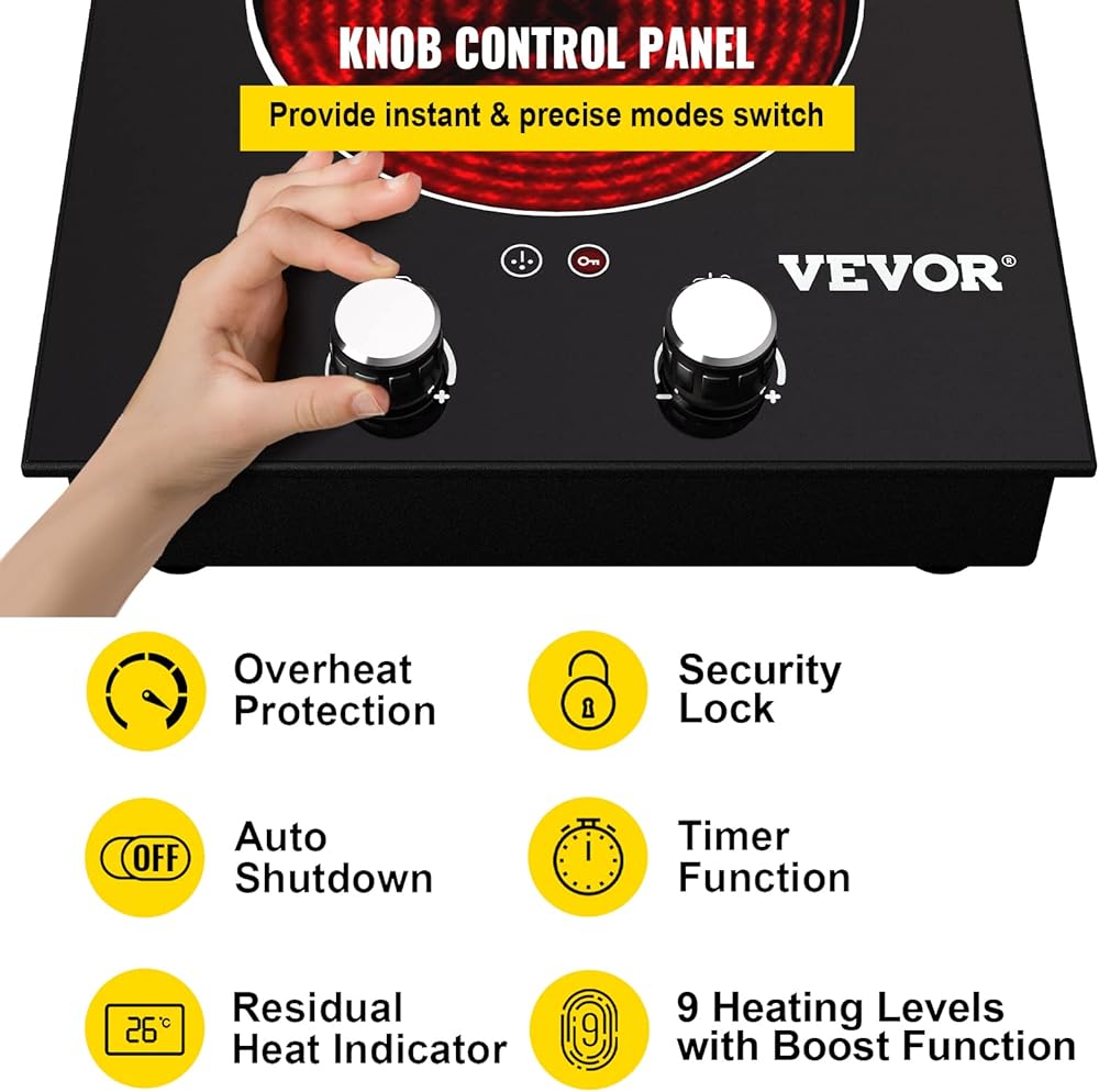موقد كهربائي مدمج من VEVOR، 11 بوصة 2 شعلات، موقد زجاجي سيراميك 220 فولت مع تحكم في المقبض، مؤقت وقفل للأطفال، 9 مستويات طاقة مع وظيفة تعزيز للقلي بالبخار على نار خفيفة