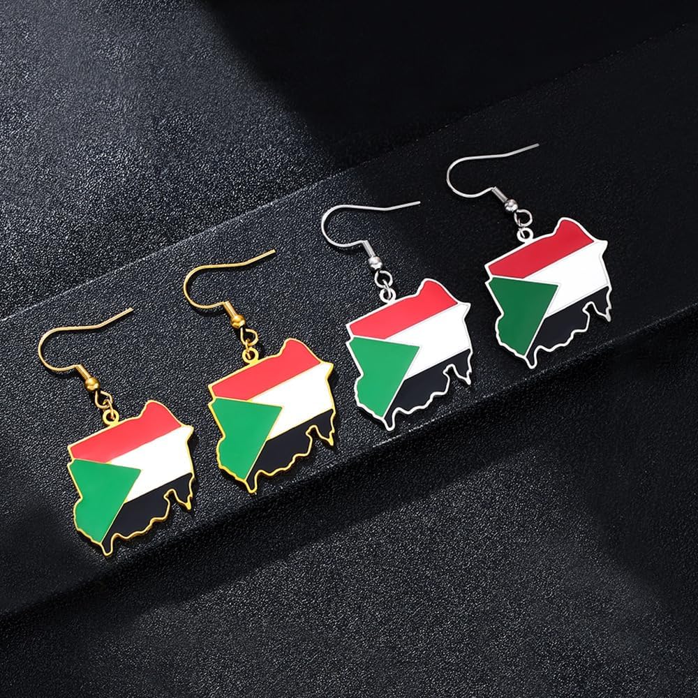 This set of Sudan Map Flag Earrings includes two pairs of earrings, each designed in the shape of Sudan's map and adorned with the flag's signature red, white, green, and black colors.