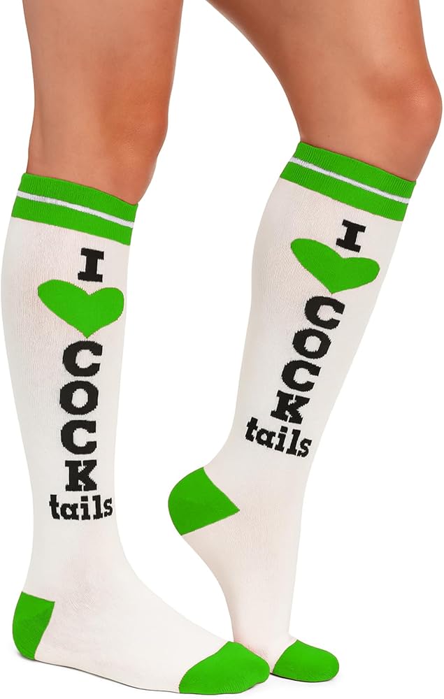NOVELTY APPEAL: Let your wild side shine with these daring knee-high party socks! Featuring vibrant colors and playful 'I ♥ COCKtails' lettering, they bring a little cheeky play on words a and a whole lot of attitude—fun, flirty, full of personality, and just the right amount of naughty!