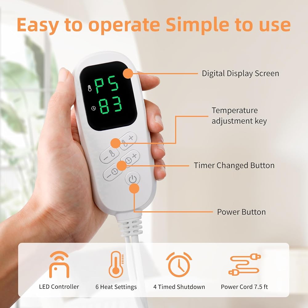 • 【تحكم دقيق في درجة الحرارة بستة مستويات مع حماية مؤقت ذكية】6 إعدادات لدرجة الحرارة (100 درجة فهرنهايت - 150 درجة فهرنهايت) تلبي الدفء اليومي، وتخفيف الألم العميق، أو الراحة المخصصة لتشنجات الدورة الشهرية، والتسخين السريع، ومؤقت الإغلاق التلقائي ذو 4 مستويات (30/60/120/180 دقيقة) يمنع ارتفاع درجة الحرارة، وسلك تمديد بطول 7.5 قدم (حوالي 2.3 متر) لحركة غير مقيدة - يمكنك الاسترخاء والراحة سواء في السرير، على الكرسي، أو على الأريكة.