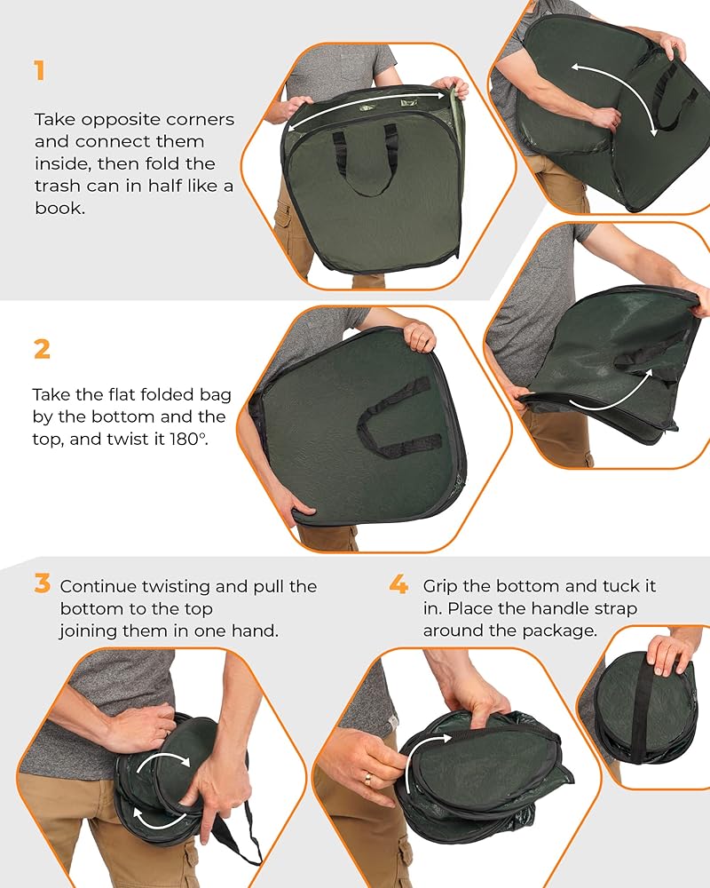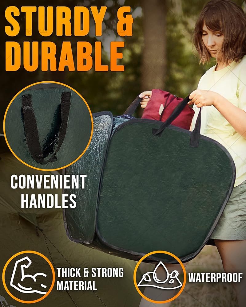CONVENIENT & MULTIPURPOSE - Pop up trash can is super convenient to take anywhere with you and store easily. Therefore, it can be used as a camp trash can, pop up recycle bin or garden bag, yard waste trash can, seasonal storage or even your laundry bag - it goes with anything!