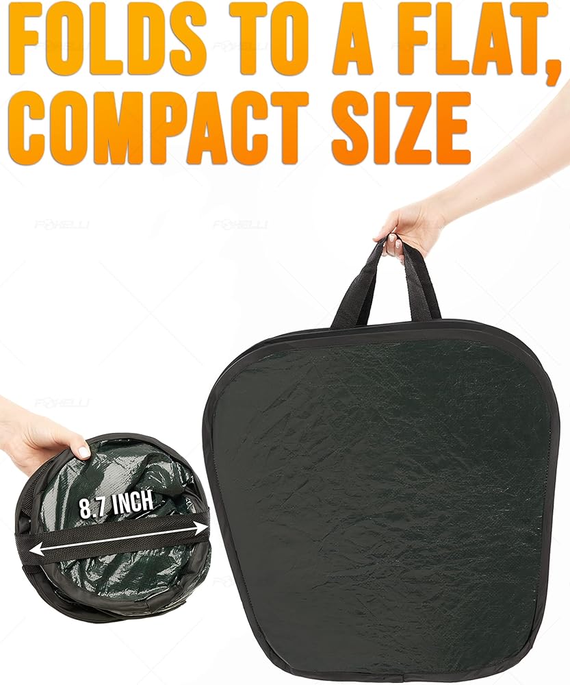 EXTRA LARGE YET LIGHTWEIGHT- Foxelli collapsible garbage can is perfect size for a weekend campout or being used as a yard waste container. Why use smaller bags when you can replace them with this portable trash can instead? Foxelli camping trash bin can hold 46 gallons of waste. Excellent for picking up leaves and yard waste, or simply using it as a lightweight portable trash can whenever needed.