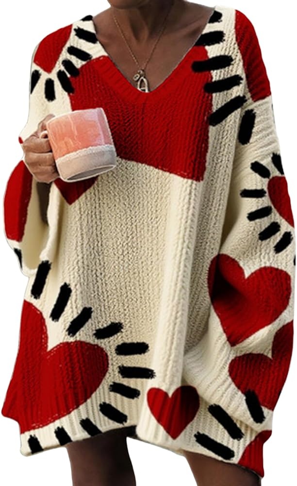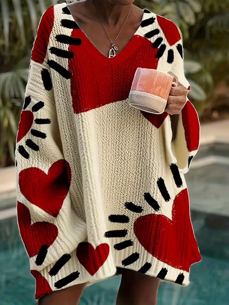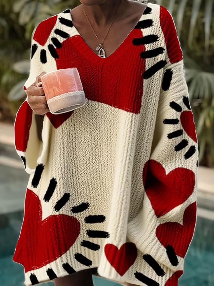 This long, heart-print knitted sweater cleverly combines playful patterns with a practical design. It's not just a warm sweater, but a piece that expresses warmth and a sense of style. The delicate V-neck and flattering long design are specifically crafted for plus-size women who seek both comfort and style.