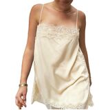 Feature: Satin lace long cami top, solid color, floral lace trim camisole, sexy low cut, v neck, drawstring ruched, side split, irregular hem, slip dress, summer going out streetwear, fairy grungr aesthetic coquette, slight backless detail, and flowy a line cut