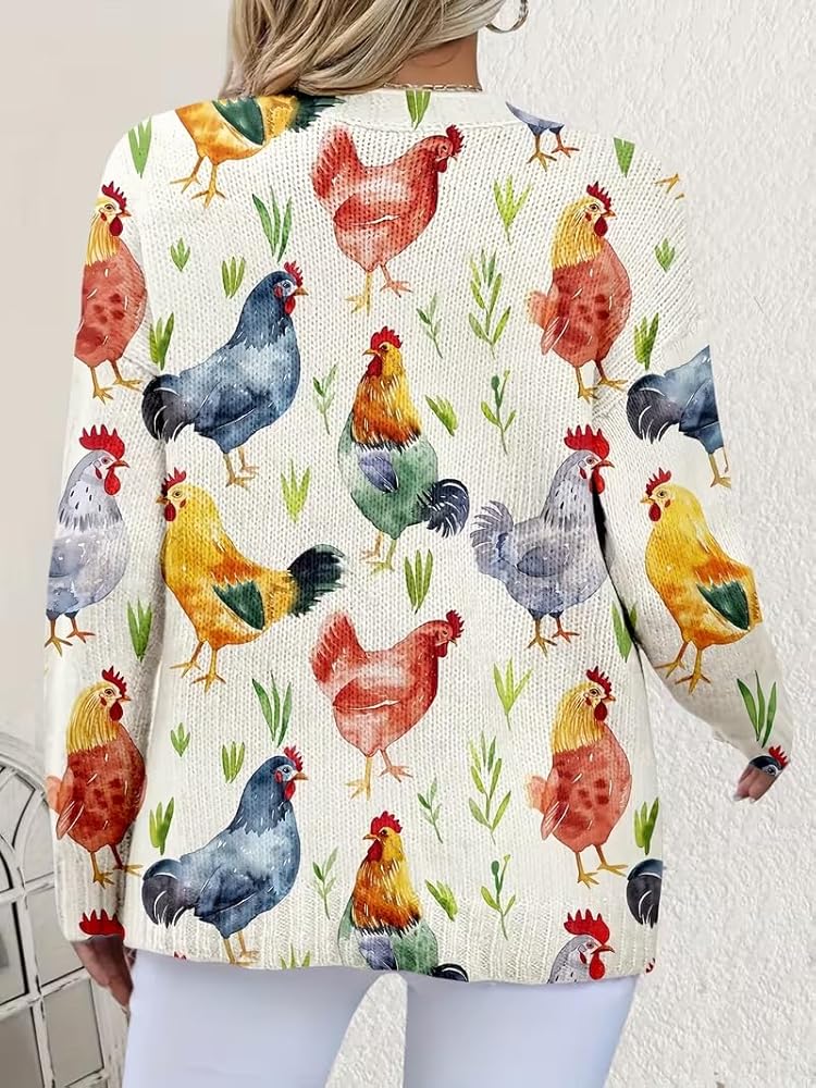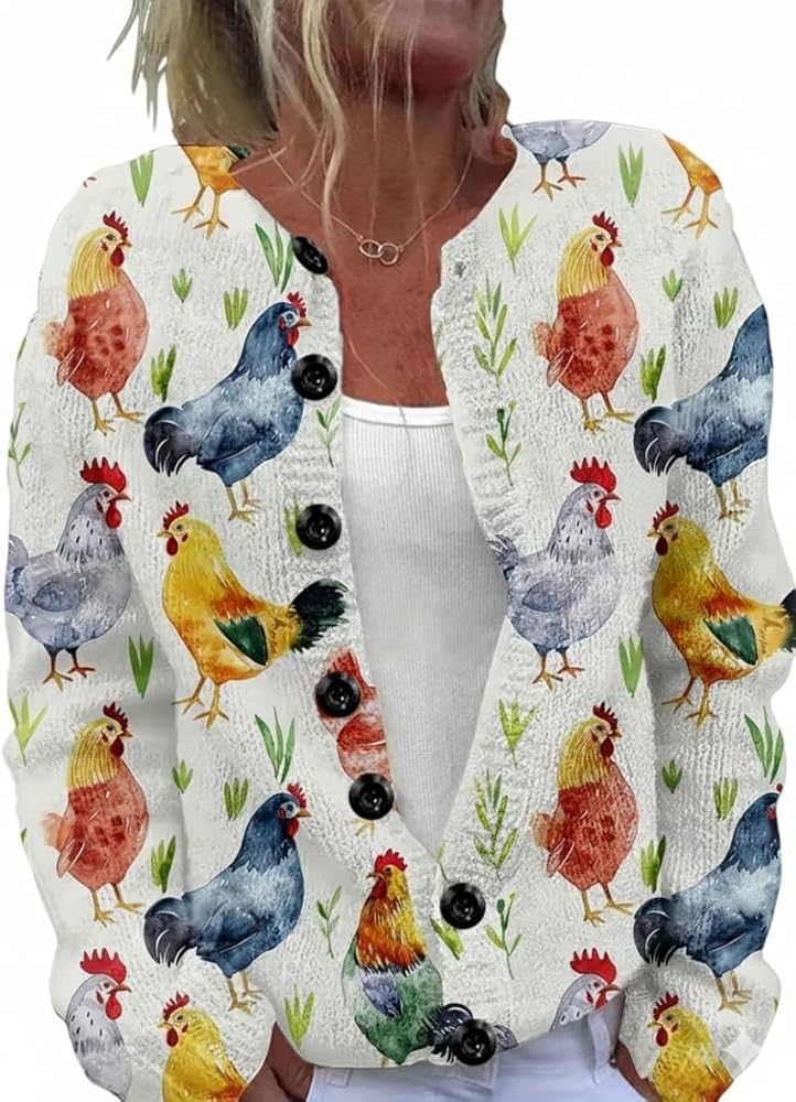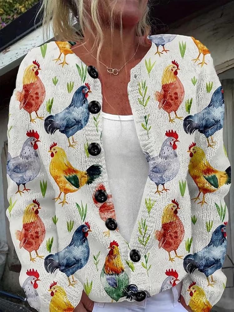 This cartoon chicken print cardigan brings the relaxed charm of country life into your urban routine. The adorable poultry pattern is not only an expression of childlike innocence but also a yearning for a life closer to nature. Whether worn for a farm-themed event or as a unique touch to your daily commute, it will bring a refreshing vibrancy to your autumn and winter wardrobe.
