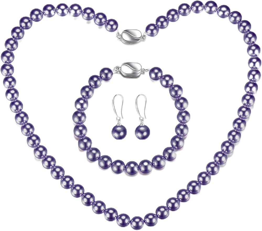 مجموعة مجوهرات اللؤلؤ للنساء: طقم قلادة وقلادة من اللؤلؤ الأبيض المستدير مقاس 8 مم وأقراط كهدية عيد ميلاد الزفاف