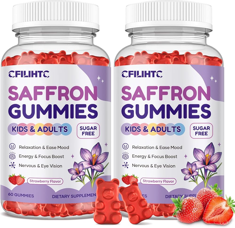 علكات الزعفران للأطفال والكبار، مكملات الزعفران 20 في 1 مع 88.5 ملجم من مستخلص الزعفران، ب6، ب12، ج، د3، مغنيسيوم للهدوء، التركيز، الأعصاب، خالي من السكر، نباتي، غير معدل وراثيًا - نكهة الفراولة، 60 قطعة in Kuwait