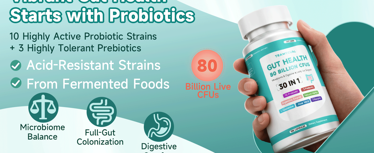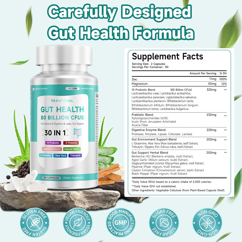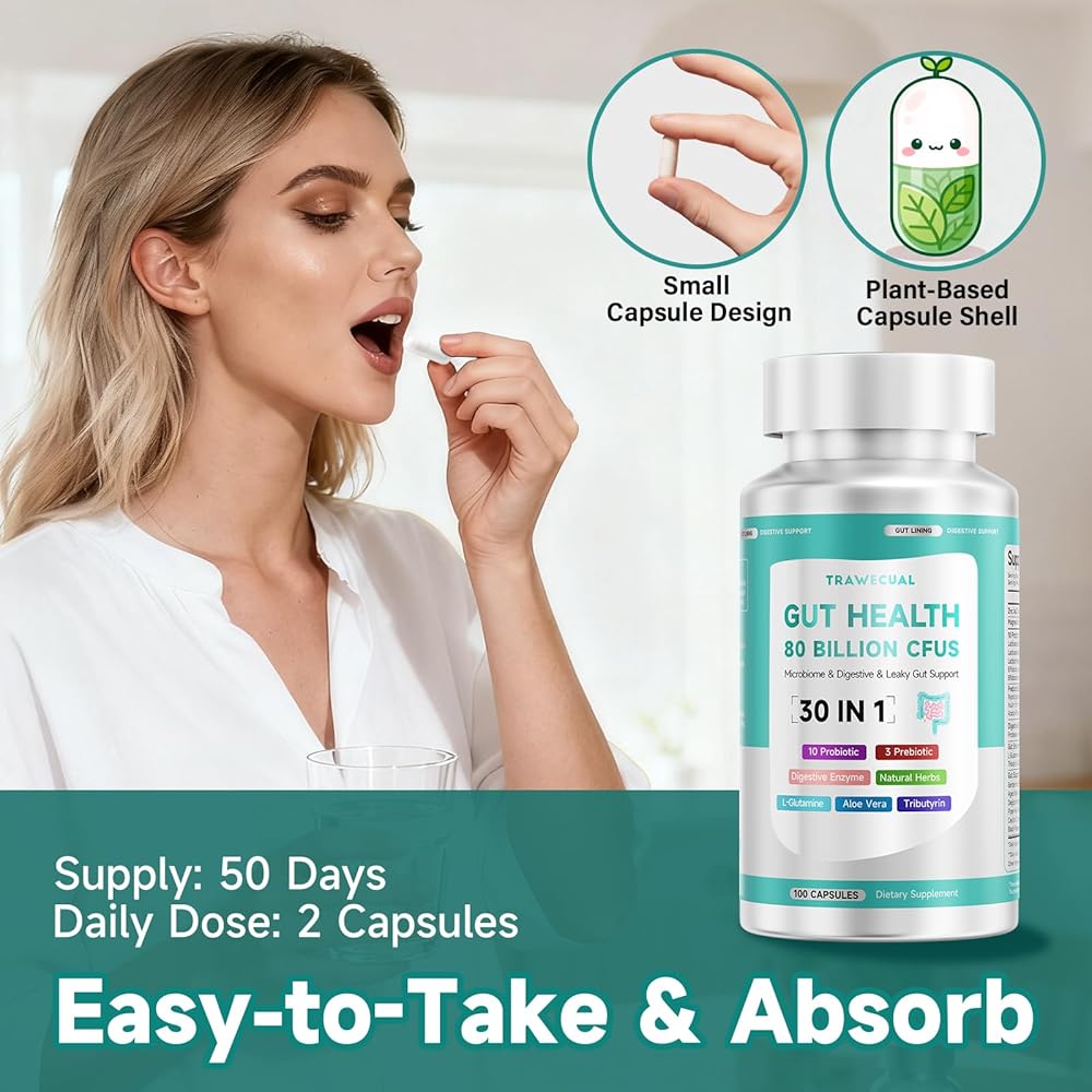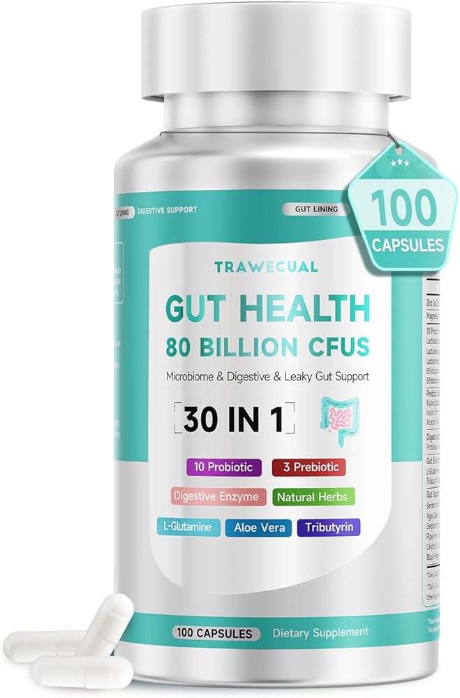 مكمل كبسولة صحة القناة الهضمية Trawecual، يدعم الميكروبيوم، والأمعاء المتسربة، والهضم، مع 80 مليار وحدة تشكيل مستعمرة من البروبيوتيك، والبريبايوتكس، والإنزيمات الهاضمة، ومكمل غذائي لصحة الأمعاء 30 في 1، 100 كبسولة