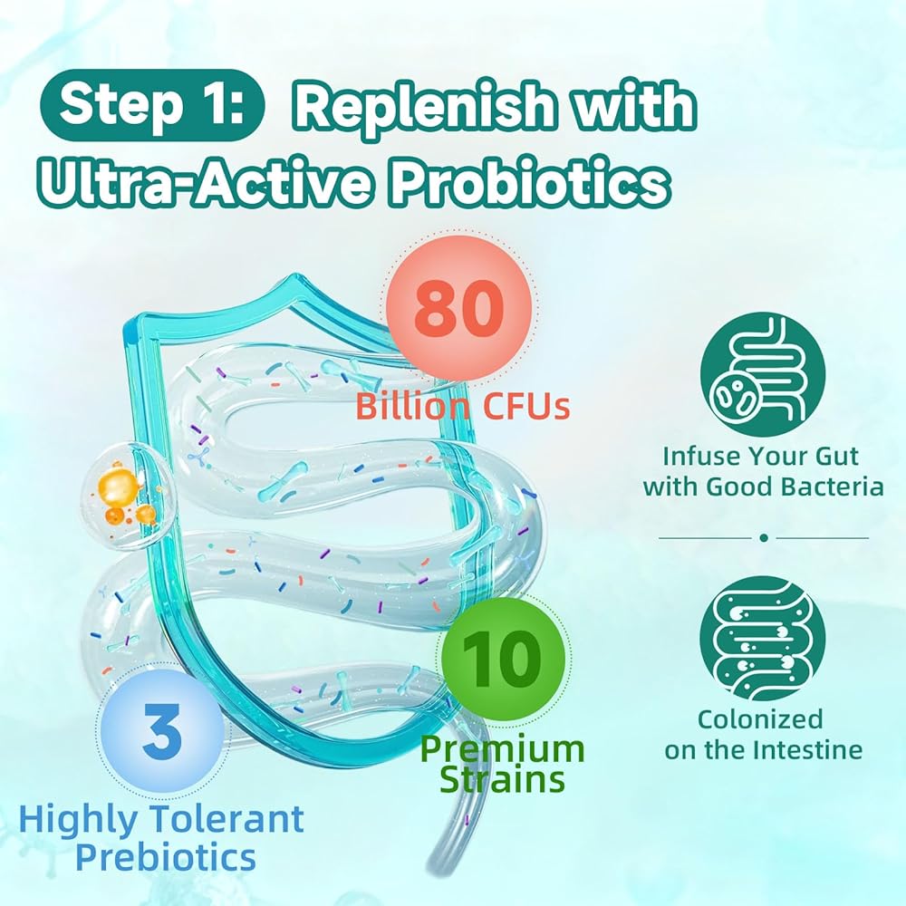 • بروبيوتيك عالي الفعالية - يتفوق هذا المكمل الصحي للأمعاء على المكملات الغذائية العادية لصحة الأمعاء، حيث يوفر 80 مليار بروبيوتيك CFU لكل وجبة، بما في ذلك 10 سلالات متميزة لدعم صحة الجهاز الهضمي. مقترنًا بثلاثة أنواع من البريبايوتك عالية التحمل، فإنه ينشط البروبيوتيك ويدعم التغطية المعوية الكاملة.