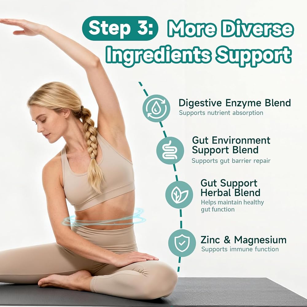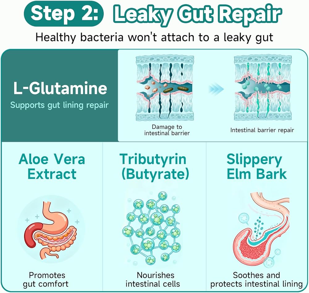 • دعم حاجز الأمعاء المتسرب: يحتوي على L-Glutamine، وTributyrin، ومستخلص Aloe Vera لدعم إصلاح الأمعاء المتسربة، وتحسين امتصاص العناصر الغذائية، وتقوية دفاعات الأمعاء، مما يساعد أمعائك على البقاء بصحة جيدة.