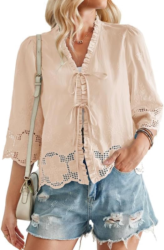 تصميم تفصيلي: بلوزة برباط أمامي للنساء، قمصان علوية من الكروشيه مطرزة بالورود، زخرفة من الدانتيل المموج على الأساور والحاشية تضيف لمسة رومانسية. تُعد قمصان بوهو والقمصان النسائية غير الرسمية والبلوزة الفضفاضة الخيار الأمثل لقضاء العطلات والإجازات.