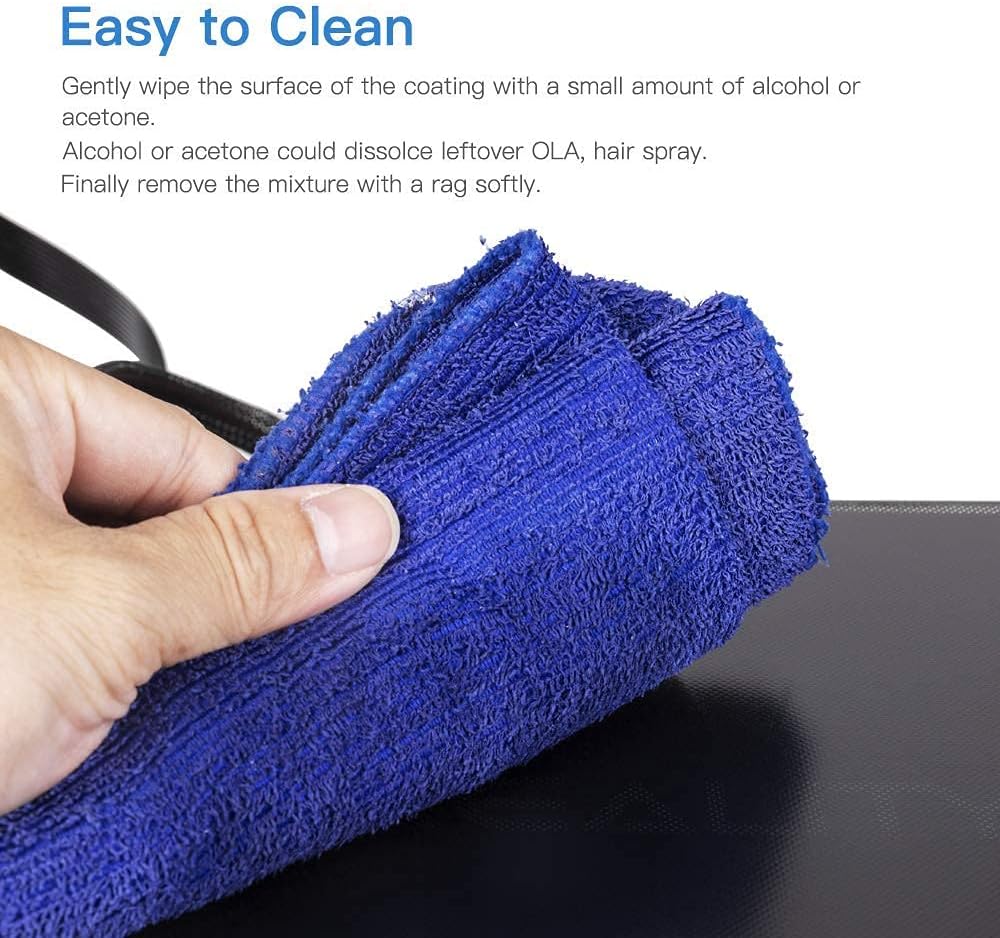 يوصى بتنظيف السرير الزجاجي جيدًا قبل الاستخدام الأول بمذيب قوي مثل كحول الإيزوبروبيل لإزالة أي بقايا قد تتداخل مع الالتصاق أثناء الطباعة.