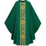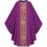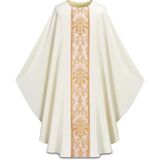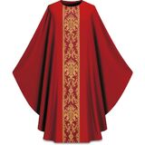 The vestment features stunning gold embroidered trim with intricate floral and religious motifs, creating a harmonious blend of tradition and artistry. The careful construction and attention to detail make this chasuble an essential piece for religious ceremonies, combining ceremonial splendor with practical functionality. The rich fabric maintains its shape and appearance, making it ideal for regular use in church services and special celebrations.