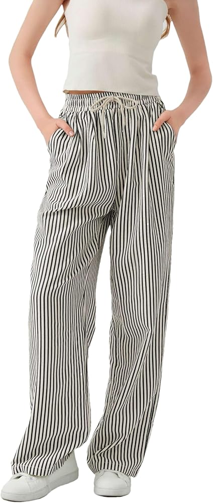 Shebote المرأة عادية مخطط بنطال ذو قصة أرجل واسعة Y2k الرباط مطاطا عالية الخصر بنطلون فضفاض صالة بالازو السراويل in Kuwait