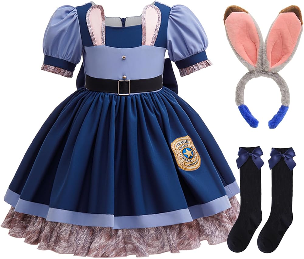 Features: Judy Rabbit Police Officer Princess Dress featured with square neck, ruffle short sleeves, 3d policy batch prints, rabbit ears and color block design, back zipper closure, soft lining, with matching headband and socks; This princess dress set featured with the character of Rabbit Police Officer, making childrens character cosplay both visually striking and true to the film, best gifting choice for the movie fans