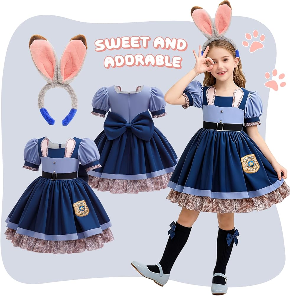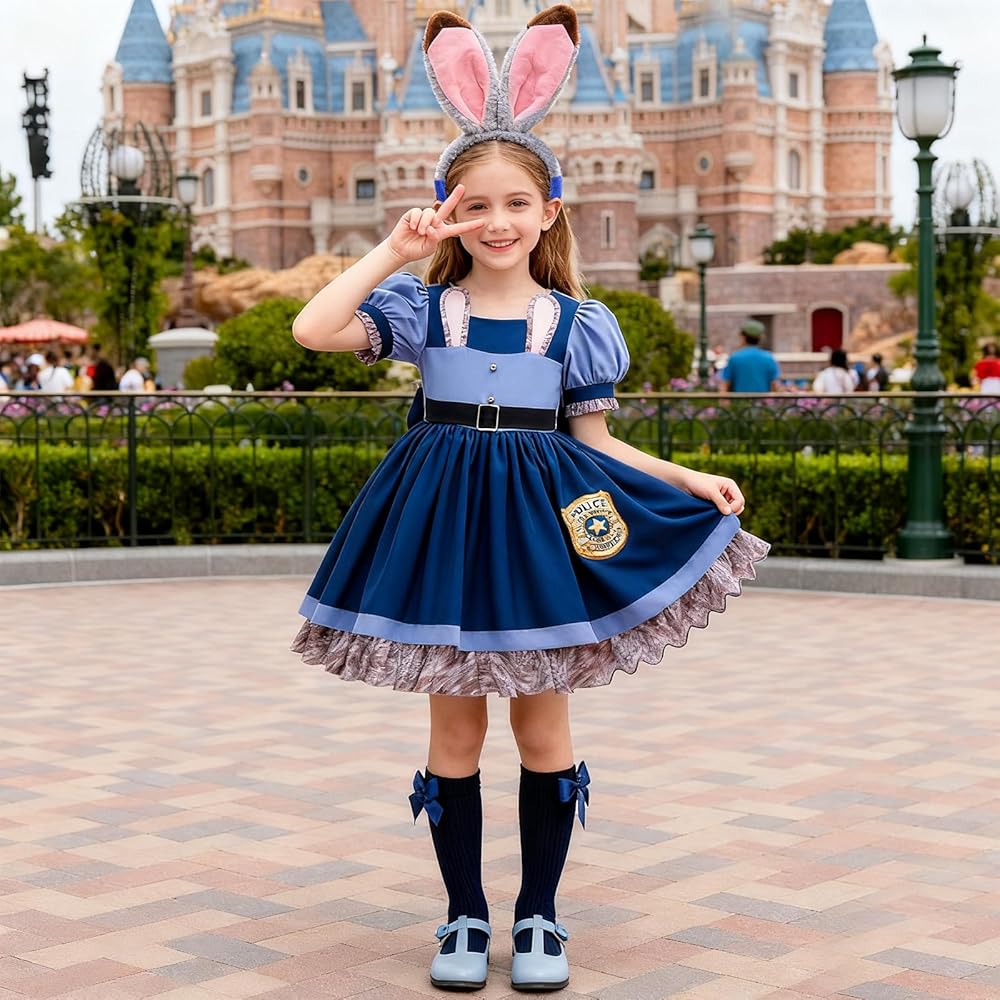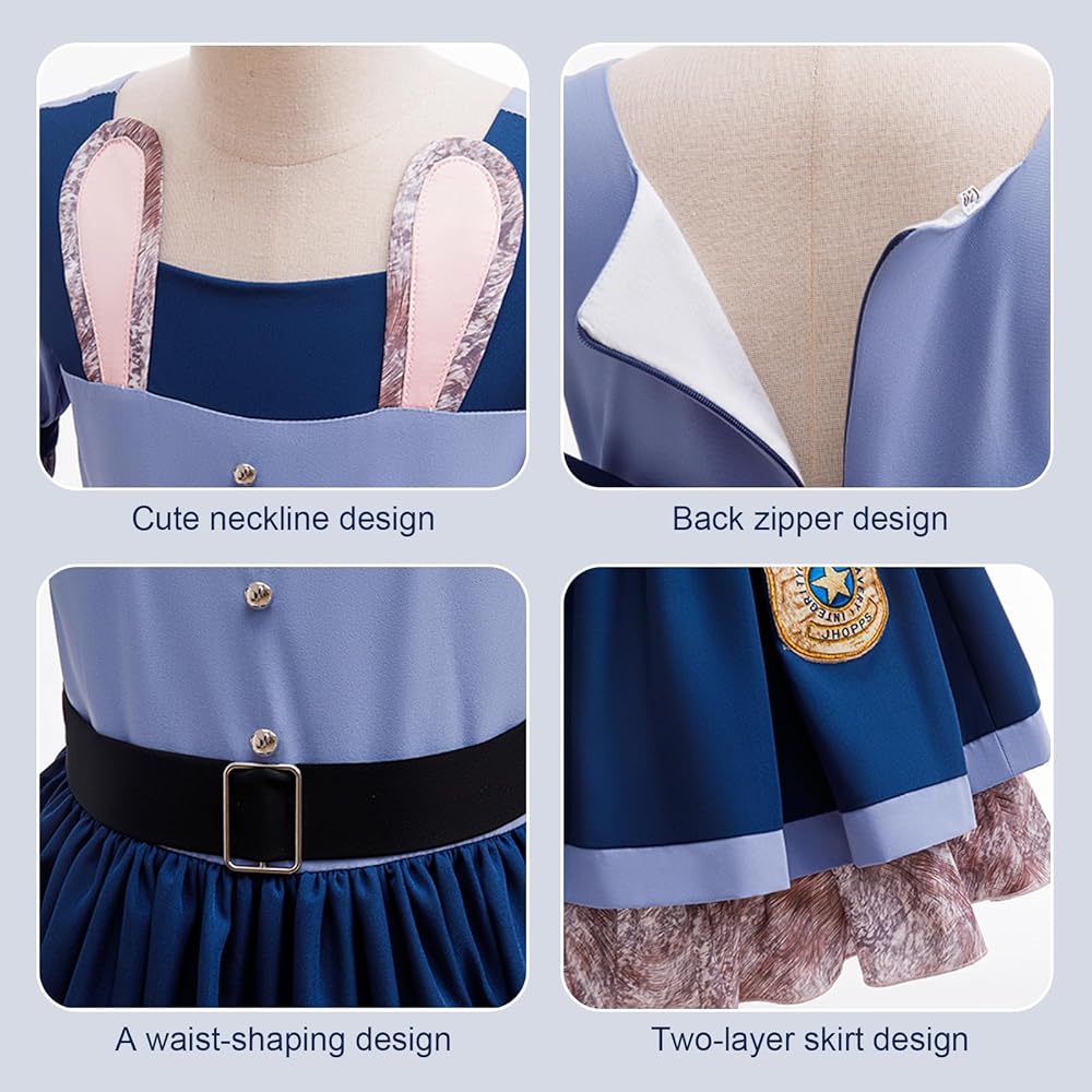 Cute Design: 2025 Popular Cartoon Movie Character Inspired Rabbit Police Officer Princess Dress with accessories for Kids Girls, with cute ruffle sleeves and rabbit ears design for a lived-in movie look and fashion, makes your princess stand out at any party or event