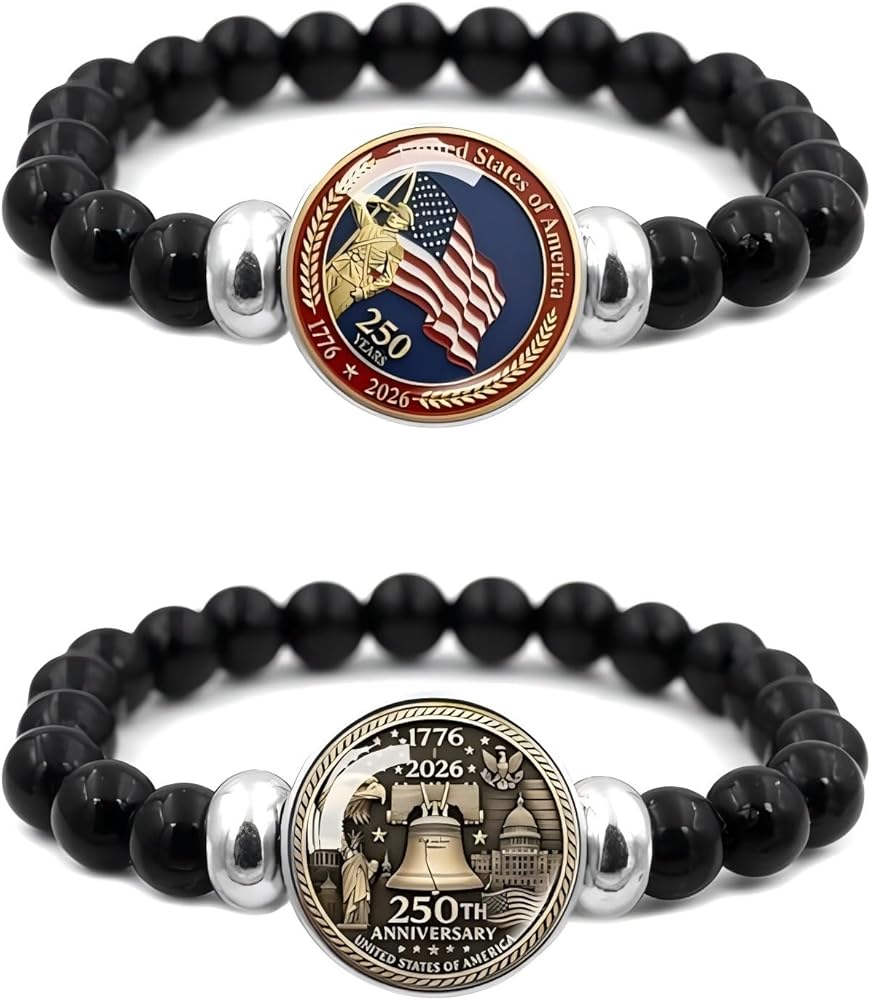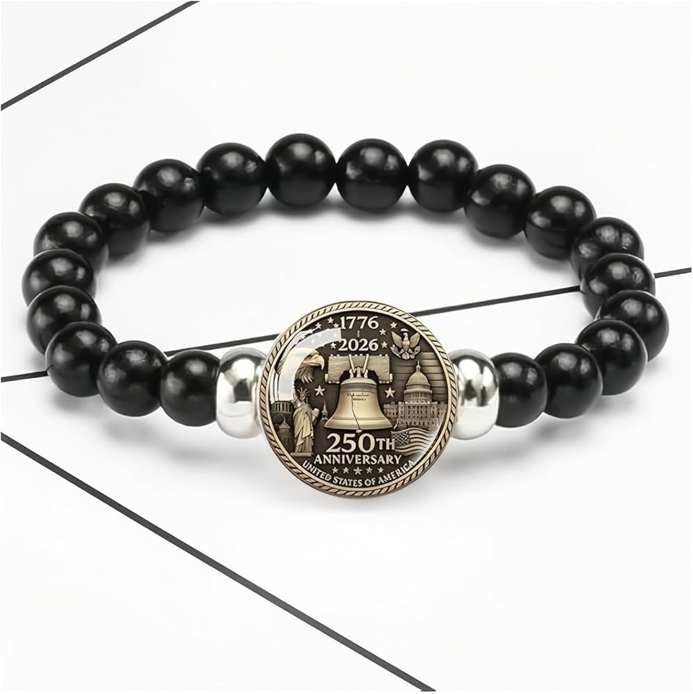 Celebrate America's 250th Anniversary: This 2-piece bracelet set features a unique design to commemorate the United States' 250th anniversary, with crystal glass flag pendants on black beads, making it the perfect patriotic accessory for Independence Day celebrations.