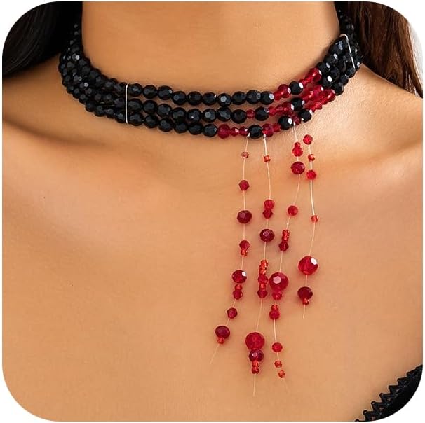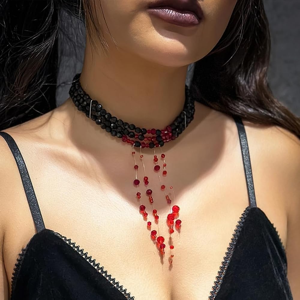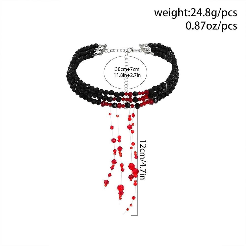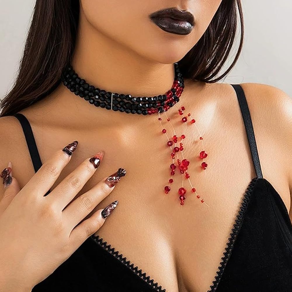 Black Beaded Crystal Necklace: This layered black beaded choker is finished with a deep, rich tone that makes the blood drip crystals and pearls pop. The tassel drop adds movement and a touch of retro charm, making it the striking accessory