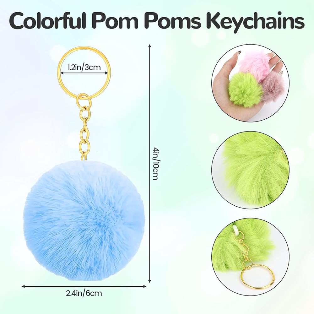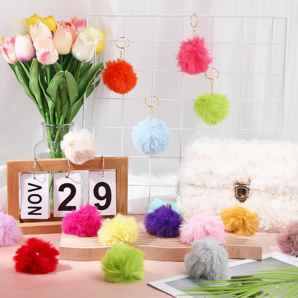 【Easy Fluff Restoration Tip】Due to vacuum packaging during shipping, the pom poms may look flat upon arrival. Simply shake them vigorously by hand or blow with a hair dryer on low heat for a few seconds—they'll quickly regain their fluffy shape. This simple step ensures your pompom key chains look their best right out of the box, ready to use or gift