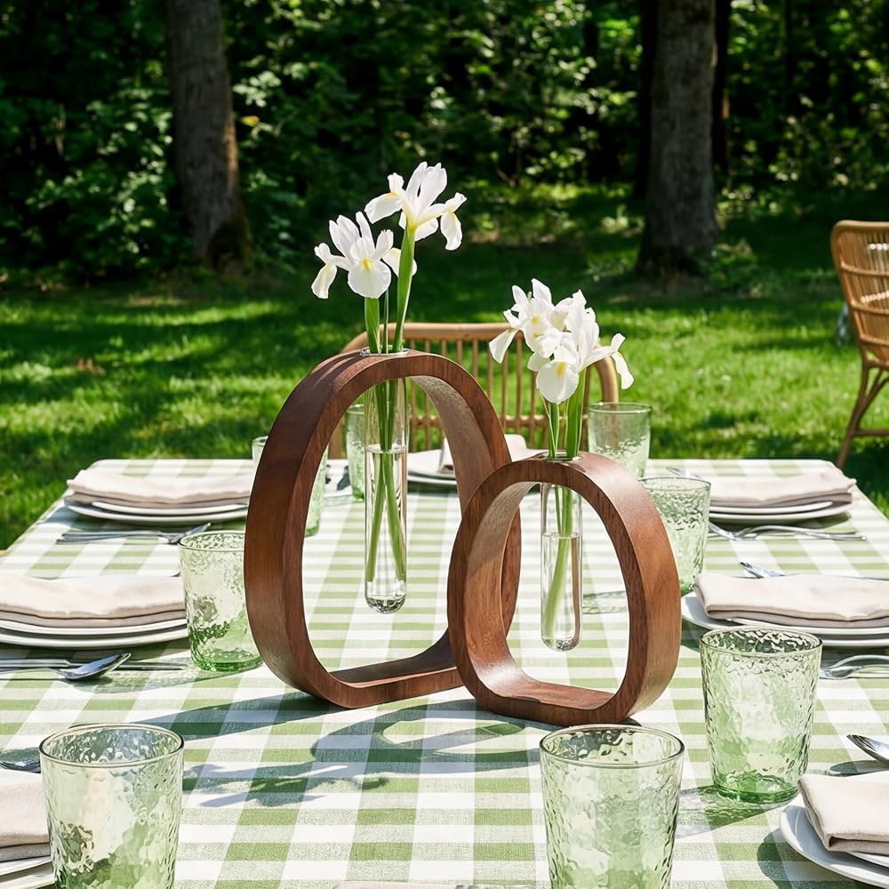 مجموعة هوموري مكونة من 2 أنبوب اختبار زجاجي مزهرية من خشب الجوز مقاس 7.5 بوصة و5.8 بوصة محطات نشر المزرعة الحديثة للديكور المنزلي، قطع مركزية للطاولة