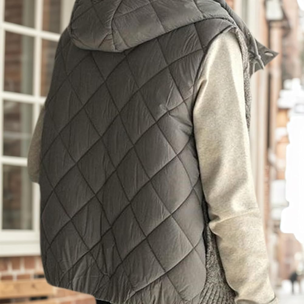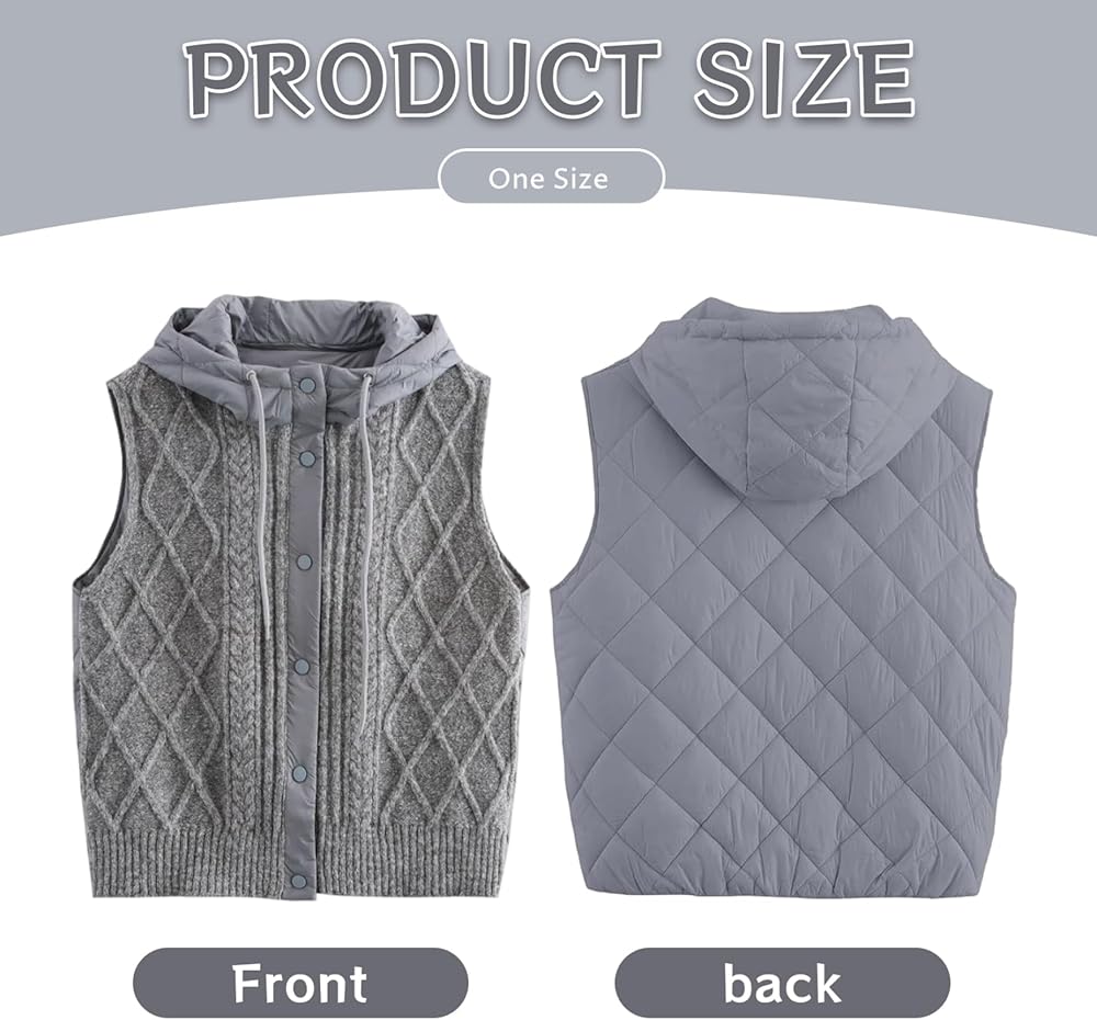 This hooded vest for women combines the cozy softness of knit fabric with the protective qualities of a quilted polyester puffer back, delivering an ideal lightweight layer for cold weather. Designed as a sleeveless jacket with a hood, it provides versatile warmth and style without restricting movement, making it perfect for outdoor activities or casual everyday wear. The one-size design provides a comfortable fit for a wide range of body types, simplifying your winter wardrobe choices. Whether layered over sweaters or worn alone, the vest's blend of materials ensures breathable insulation that keeps you warm without overheating. This practical women's hooded vest combines functionality and style with its quilted construction and knit texture, offering warmth, comfort, and a flattering look during chilly seasons. Ideal for those seeking a lightweight yet warm vest that delivers both protection from cold winds and a fashionable layered appearance.