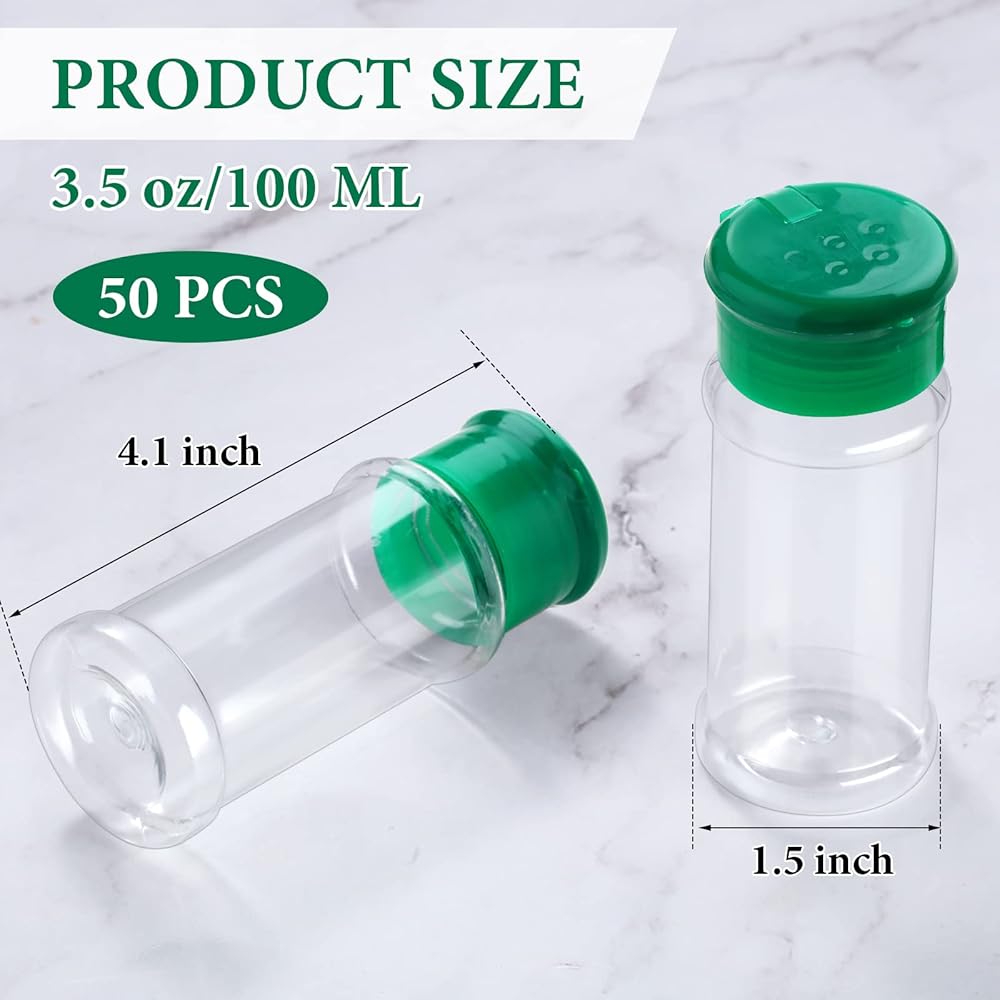 محتوى غني: نقدم لك 50 قطعة من برطمانات التوابل البلاستيكية بحجم 100 مل/ 3.3 اونصة، الكمية كافية لتلبية احتياجاتك اليومية والاستبدال؛ يمكنك أيضًا مشاركتها مع جيرانك
