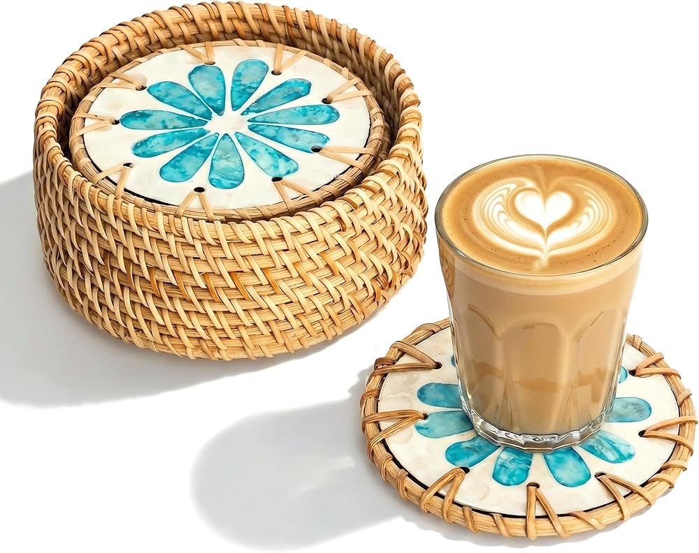Handmade from sustainably sourced rattan and genuine mother of pearl, our coasters are plastic-free, natural, and finished without harmful chemicals — a natural, planet-friendly choice for conscious living.