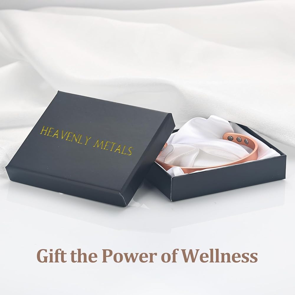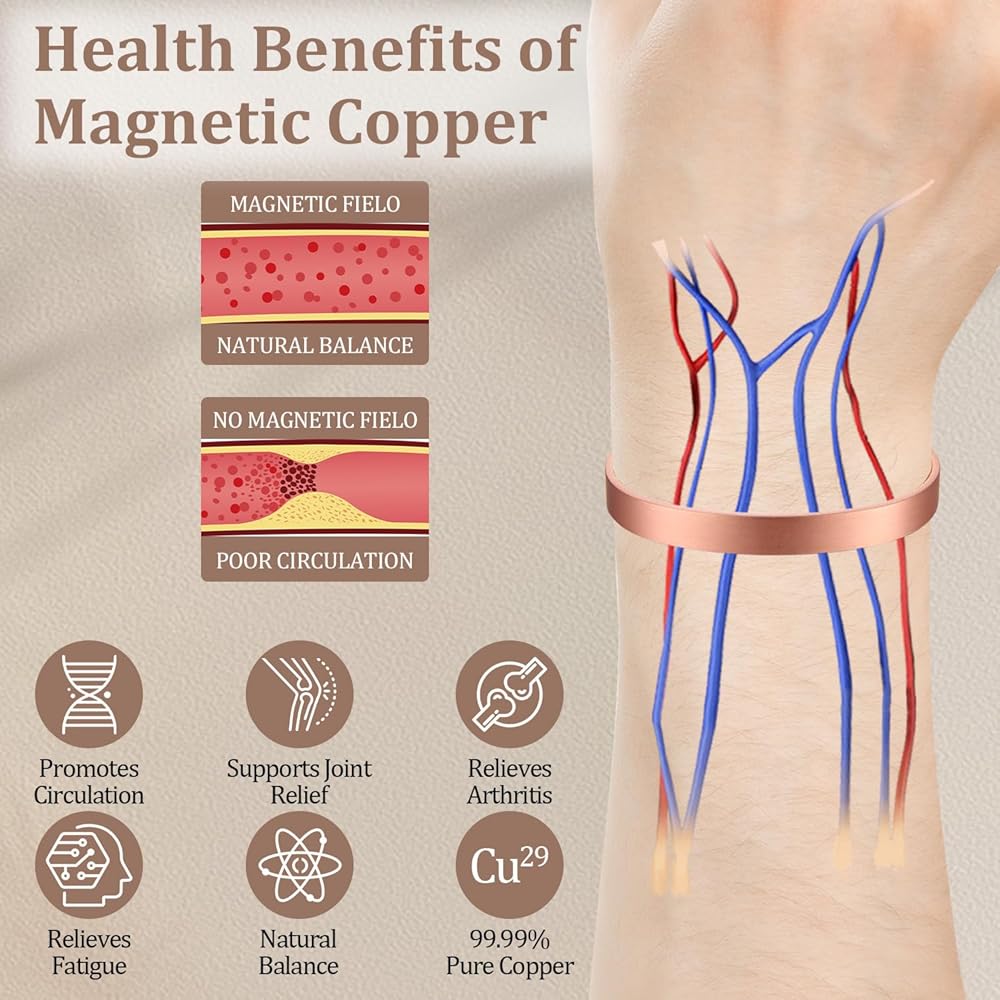 Description: Our Pure Copper Magnetic Cuff Bracelets combine timeless style with the natural appeal of solid copper. Each cuff is crafted from 99.9% pure copper and features embedded wellness magnets positioned along the inside of the band. Designed for men and women, these cuffs are fully adjustable for a personalized fit and arrive in a premium gift box. Over time, the copper develops a unique patina, adding vintage character, or it can be polished to restore its shine. Available in multiple designs including Cross, Twisted, Smooth, and Hammered styles, these cuffs deliver everyday versatility in a durable, comfortable design. Highlights: 99.9% pure solid copper Embedded magnetic therapy magnets Adjustable cuff fit for men or women Gift box included