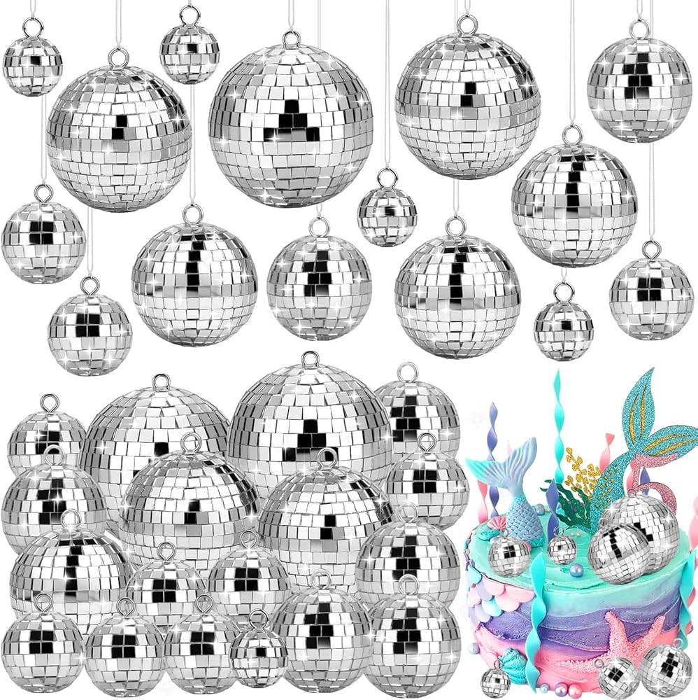 28 Pcs Disco Ball Decor, 6 Size Disco Ball Ornaments Mini Mirror Silver Disco Balls Reflective Hanging, Small Balls Hanging Ornaments for Cake Topper, 70s Themed Wedding Party