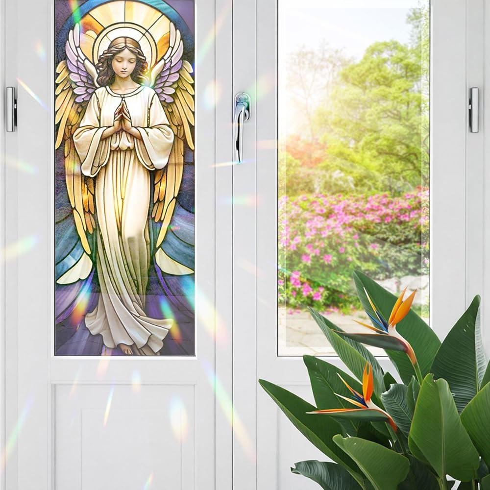 🌞 UV Protection & Heat Control: Designed for smooth, flat glass surfaces only, this window cling reduces heat transfer and blocks up to 95% of harmful UV rays. It helps protect your skin from radiation while minimizing fading and aging of furniture, making your home more comfortable and stylish. We have many motifs such as : Celtic Knot, Jesus, Angel & Radiant Light, Angel & Divine Light, Our Lady of Sorrows, Yoga, Star of David, Buddha, Magic Book Stack.