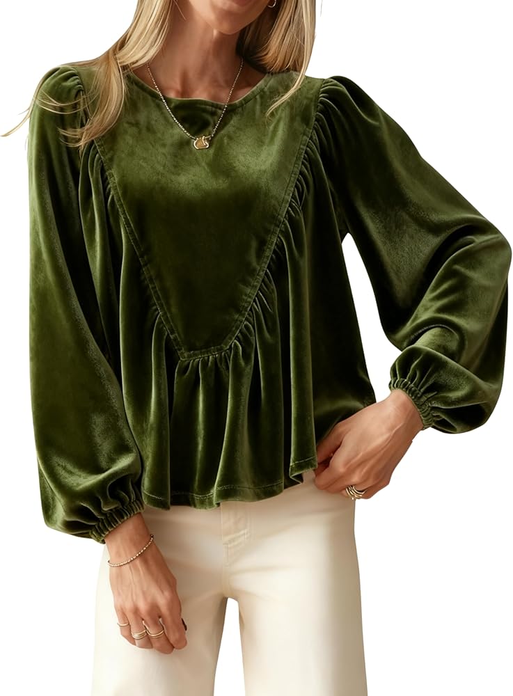 الميزة: صورة ظلية أنيقة بيبي دول. يتميز هذا القميص الأنيق بقصة متأرجحة مريحة على شكل حرف A وحاشية بيبلوم رشيقة تخلق صورة ظلية جذابة ومتدفقة. تضفي الأكمام الفقاعية المميزة وخط العنق الدائري الكلاسيكي لمسة من الدراما المتطورة، مما يجعلها مثالية للمواسم الباردة.