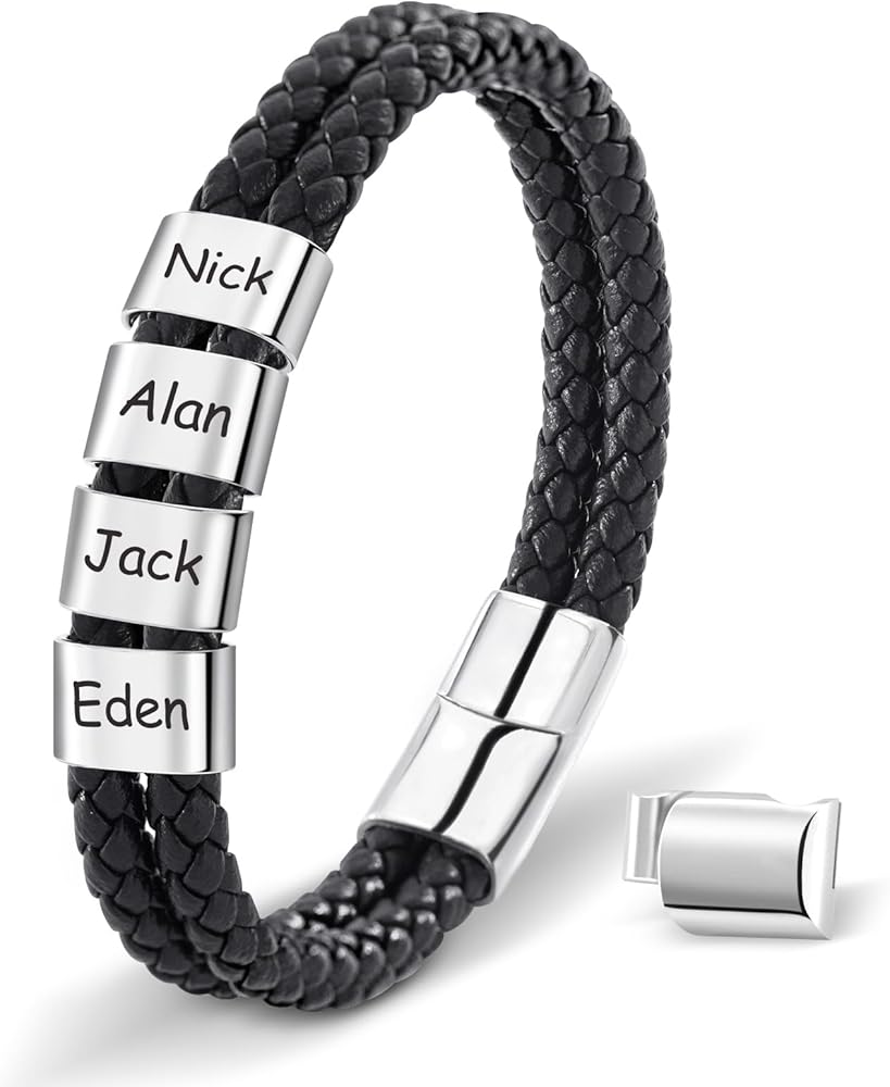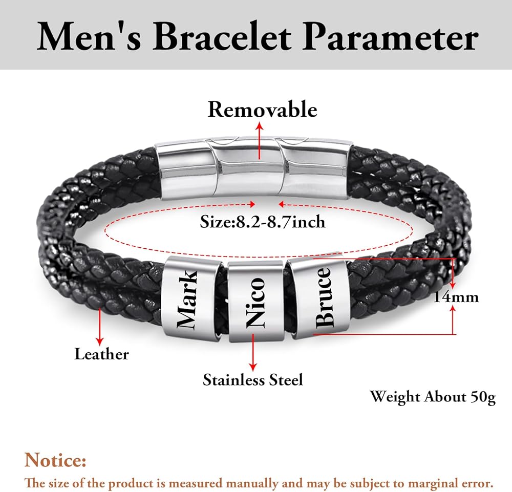 سوار جلدي مخصص للرجال - أساور رجالية مخصصة بخرز فضي لتخصيص أي اسم. حبل جلدي منسوج فريد وخرز منقوش يجعلك تشعر بالراحة والأناقة في الارتداء. سوار بأسماء محفورة يحتوي على معنى عائلي وهو أفضل هدية للأب.