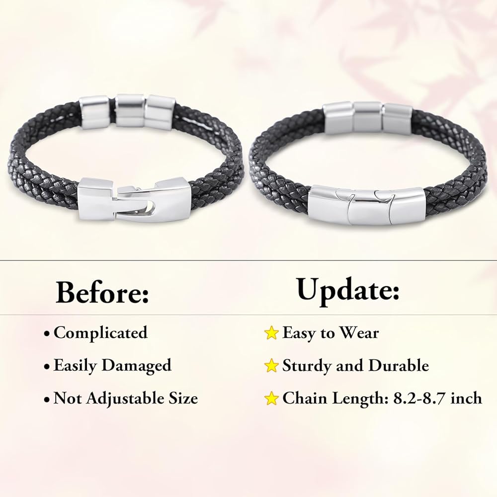 مادة الأساور - الأساور الجلدية للرجال مصنوعة من الجلد المضفر، وخرزة ومشبك من الفولاذ المقاوم للصدأ. يتم ربط الحبال الجلدية المضفرة باللون الأسود/البني مع خرزات فضية ساحرة لارتدائها بشكل أكثر أناقة في الحفلات أو الاحتفالات. يبلغ طول السلسلة 8.26 بوصة (21 سم)، ويناسب معظم مقاسات معصم الرجال، ولن ينزلق بسهولة. مناسب بشكل خاص كهدية للأب والجد.