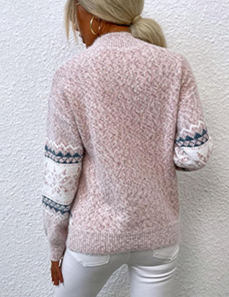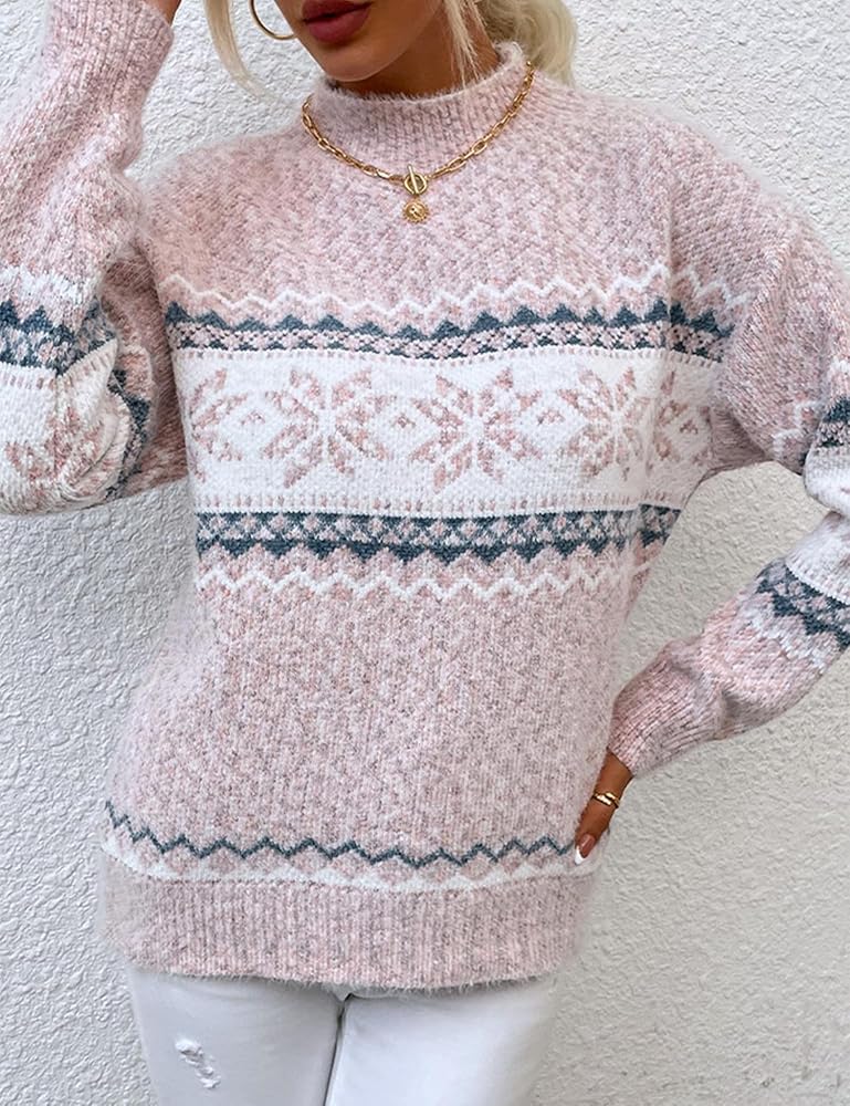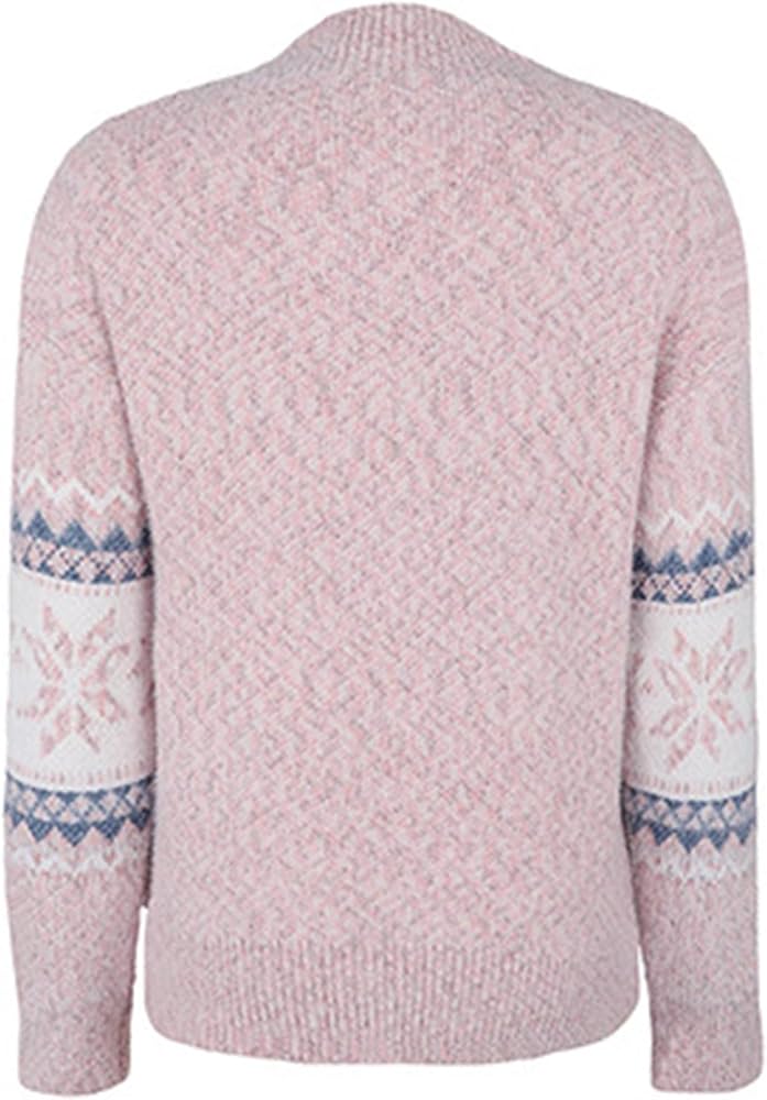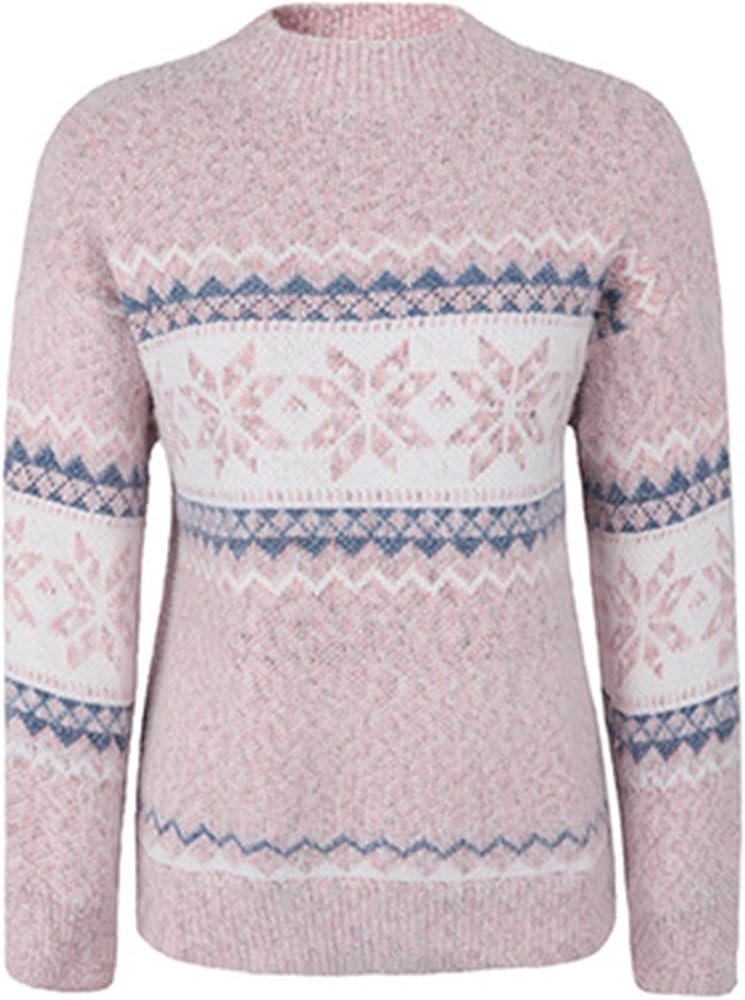 تصميم احتفالي وأنيق: استمتع بالدفء بروح العطلة مع سترتنا الوردية اللطيفة، التي تتميز بنمط ندفات الثلج المبهج بالكامل ورقبة قمر جذابة تضيف لمسة من الأناقة الأنثوية.