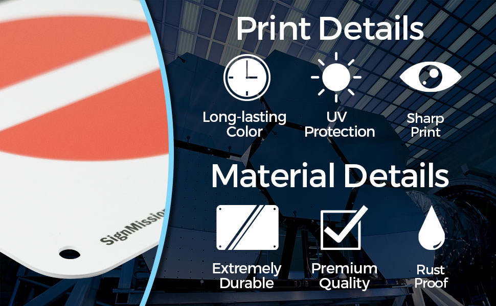 Make Sure You & Your Business are OSHA & ANSI Compliant. Is your business or work space 100% covered and up to code with current signage and labels? Never leave yourself exposed to lawsuits, fines, or reprimands - the integrity of your business and safety of others depends on it. Choose from Thousands of Signs. We have signs in all different shapes, sizes, and colors for almost every single business, workplace, manufacturing plant, production facility, or construction zone. Check out all our first aid signs, danger signs, keep door closed signs, electric panel hazard signs, storage signs, authorized personnel signs, lab chemicals signs and thousands more. Choose from: Aluminum, Rigid Plastic Signs or Adhesive Labels. Our signs are extremely durable yet flexible for even the most intense indoor or outdoor conditions. SignMission's full color products are fabricated right here in the United States. Vinyl decals are equipped with super strong adhesive so that you can easily apply it to glass windows, aluminum, stainless steel, sanded wood, plexiglass and many more materials and sidings. Aluminum & rigid plastic signage materials are the perfect choice for mounting on walls, doors, fences, construction and caution areas. All of our materials surpass industry standards and will provide years of durability and longevity. 6 Month 100% Money Back . Thousands of happy and satisfied businesses worldwide have turned to SignMission for all of their sign needs no matter what industry they're in or what compliance needs they have. In the highly unlikely chance that you're not 100% satisfied with your new sign or decal then simply send it back for a full refund or replacement within 6 months of the ship date. Go ahead order your OSHA Sign Today!