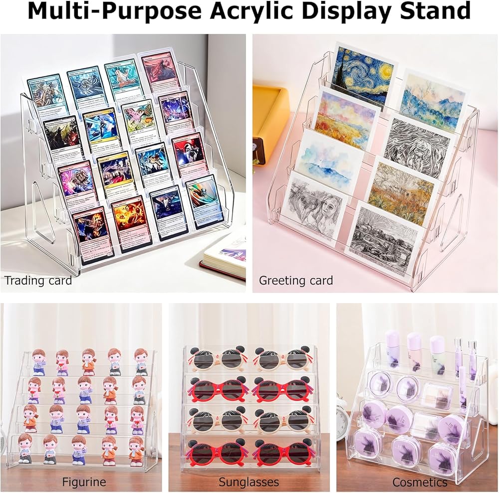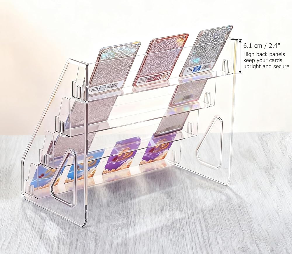 【هيكل ثابت ومتين】مصنوع من الأكريليك السميك والشفاف لمتانة وثبات يدوم طويلاً. تحافظ القاعدة المثلثة والألواح الخلفية العالية مقاس 2.4 بوصة على بطاقاتك في وضع مستقيم وآمن، وتمنع الانزلاق أو السقوط مع الحفاظ على المظهر الاحترافي.