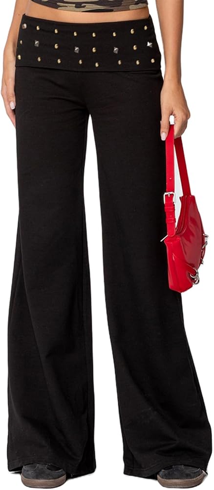 Sunloudy النساء Y2K أضعاف أكثر من السراويل برشام Foldover واسعة الساق اليوغا مضيئة طماق بسط منخفضة الخصر المتداول أكثر من جرس قيعان