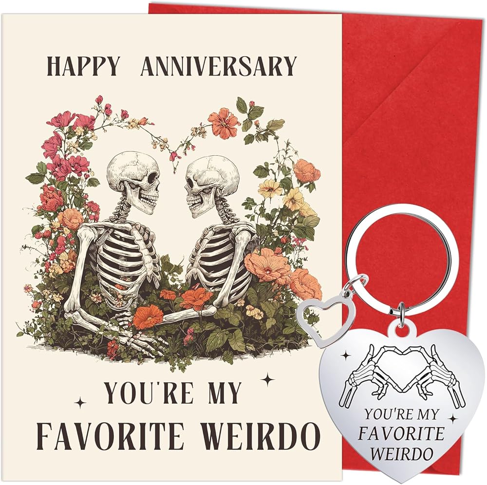 Luvsweets 2PCS هدايا سلسلة المفاتيح بطاقة الذكرى السنوية السعيدة، بطاقة حب هيكل عظمي قوطي مضحك وسلسلة المفاتيح، هدية رومانسية لعيد الهالوين في عيد الحب لها زوجة زوج صديقات صديقها