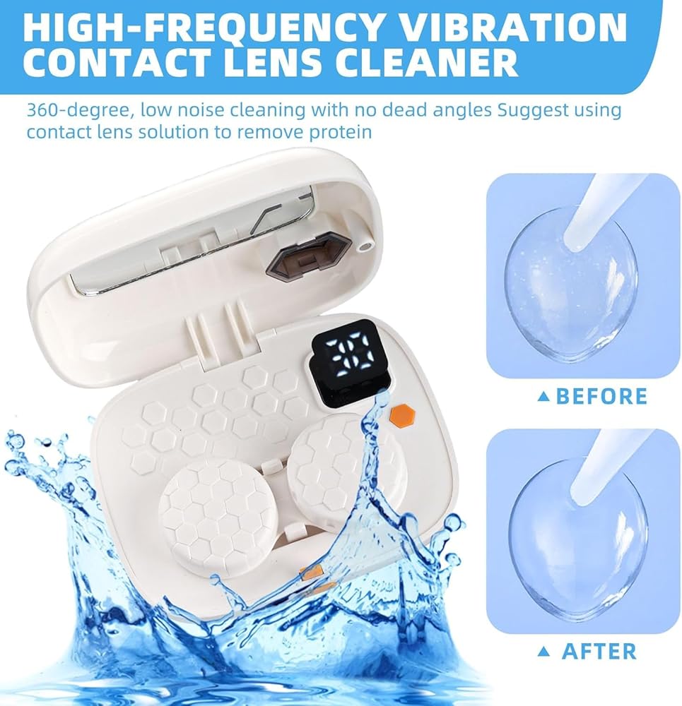 • 👓️Unique Tech: The contact lens cleaner machine is adopted by ultrasonic wave technology, a frequency higher than 47K Hertz with strong penetration, which can effectively wipe off the impurities from the lens within a short time and thus, thoroughly cleaning the lens without damage.suitable for any contact lens. It's more safe and clear than hand washing.