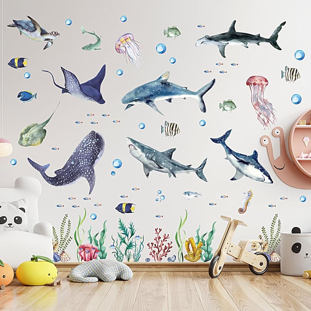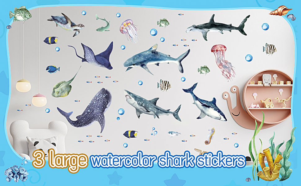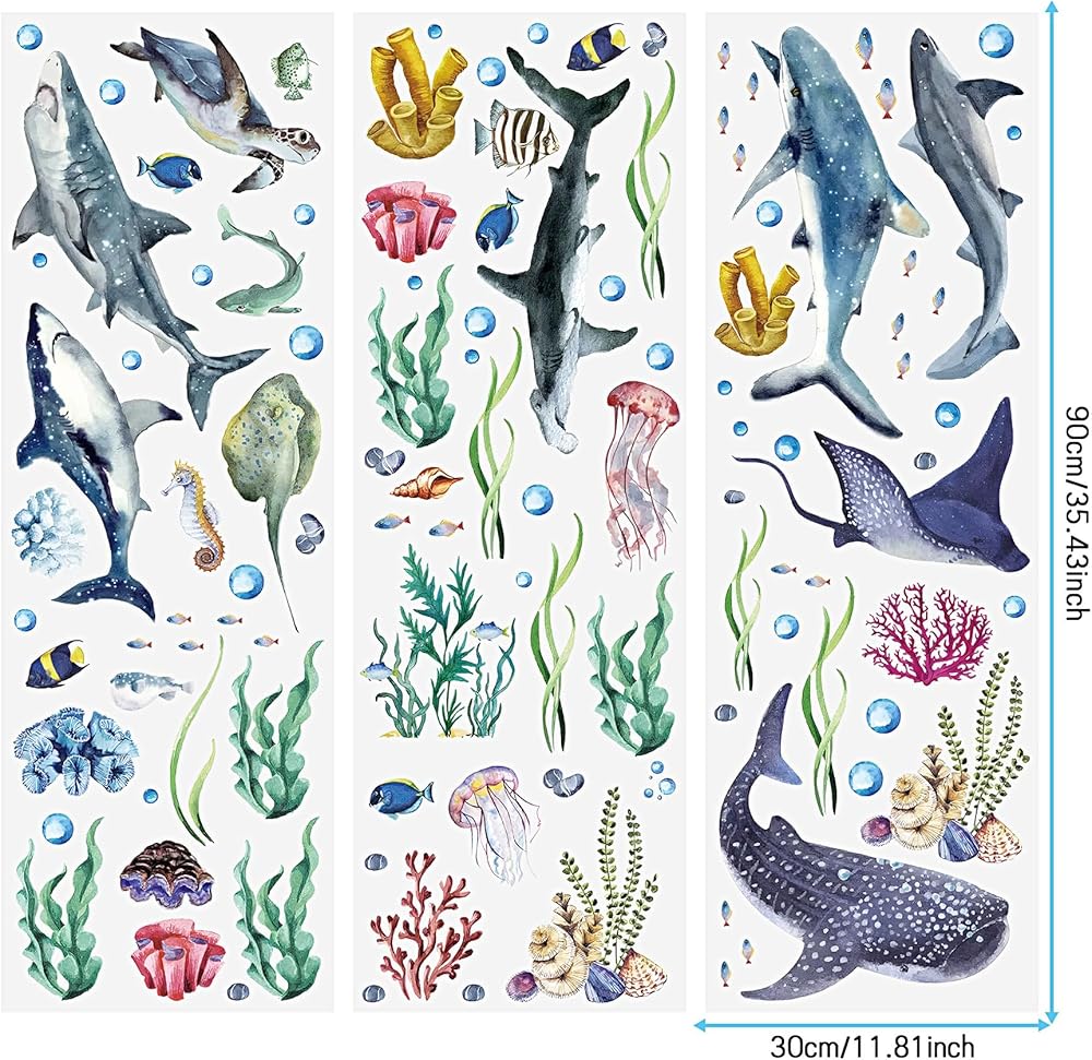 3 قطع من الملصقات الجدارية لأسماك القرش بألوان مائية وملصقات جدارية قابلة للتقشير واللصق على شكل حيوانات المحيط تحت البحر، ملصقات جدارية لموضوع الحياة البحرية وغرفة الحضانة ومستلزمات الحفلات، 11.8 × 35.4 بوصة