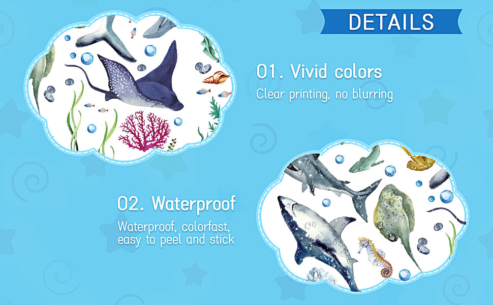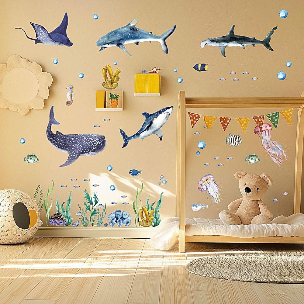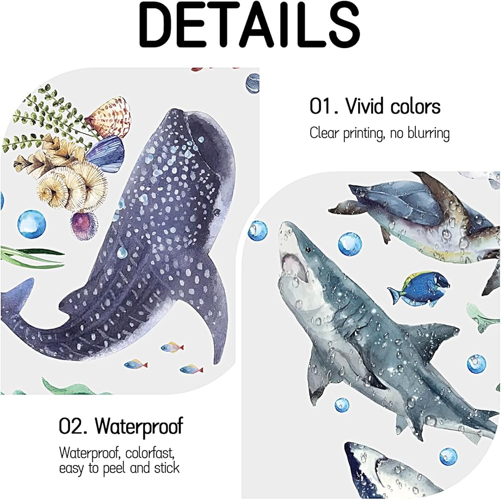 ديكور منزلي مثالي: تعد الملصقات الجدارية المتنوعة لأسماك القرش اختيارات مثالية لمساحة جميلة، فقط قم بتقشير الملصق ولصقه على الحائط، لا حاجة لاستخدام غراء النقل ولا قطع حتى تتمكن من استخدام خيالك لإنشاء تصميم خاص