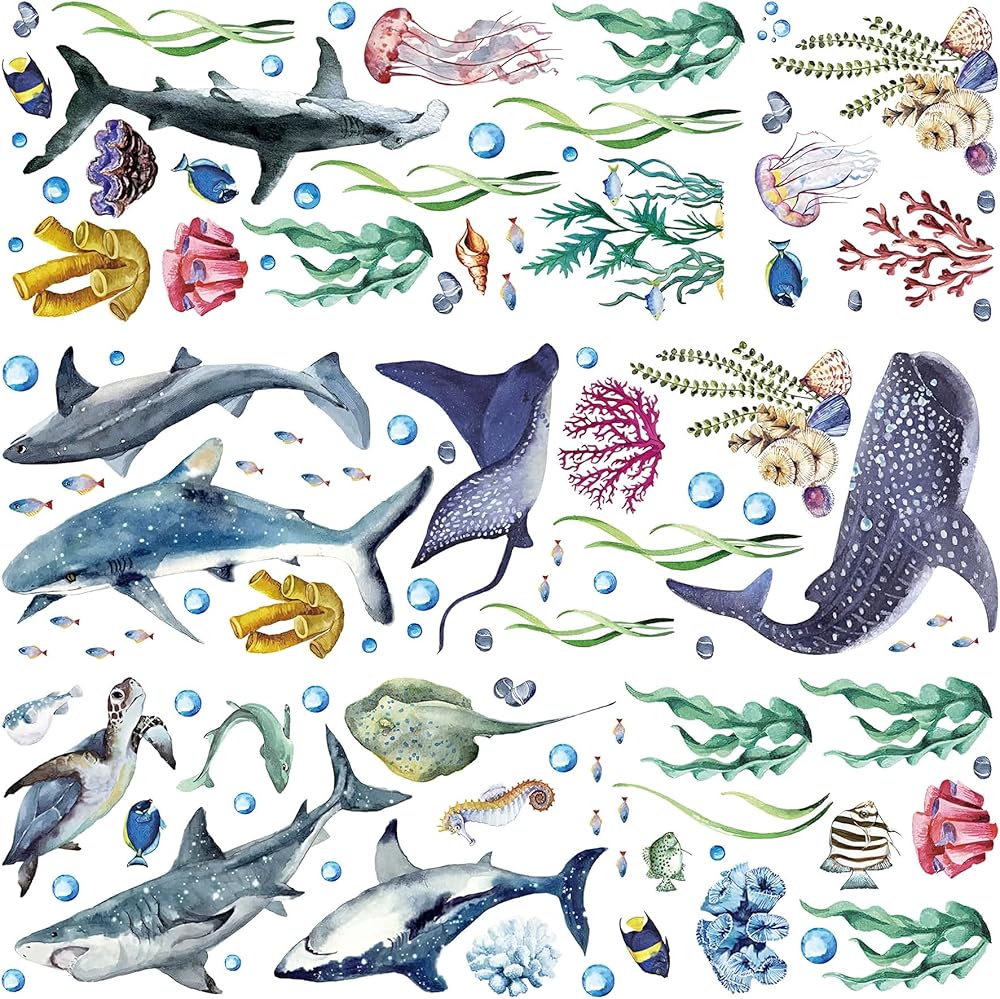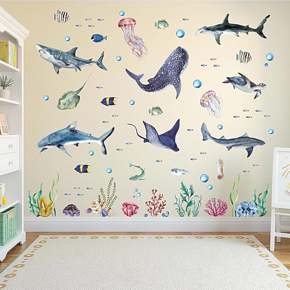 تصميم جديد ومتعدد الاستخدامات: يمكن وضع ملصق الحائط المحيط هذا على ديكورات الجدران ودعائم الصور، ولصقه في أي مكان ترغب فيه لتزيين غرفتك؛ أصبحت أسماك القرش مجتمعة وحيوانات المحيط الأخرى مثيرة للاهتمام على الفور ومحط اهتمام الأسرة