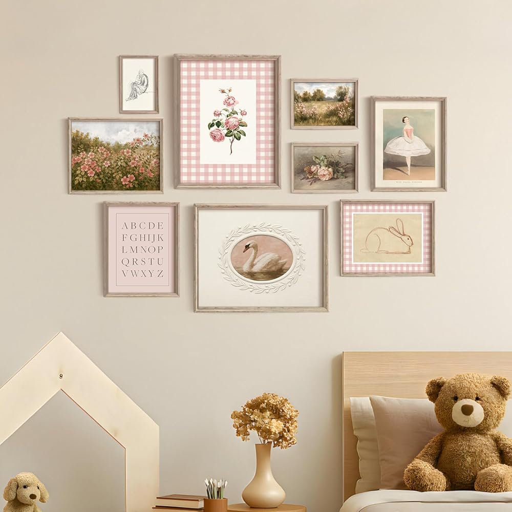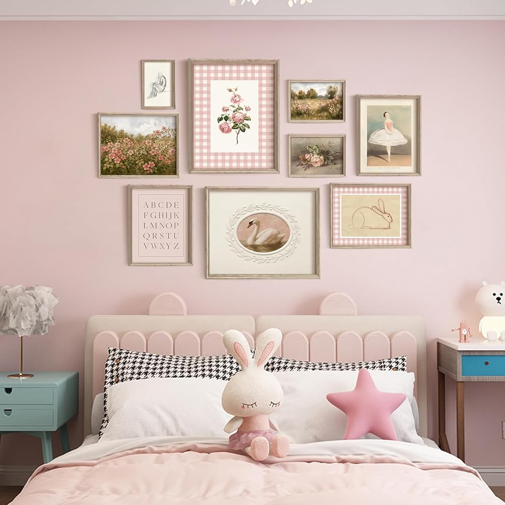 9pcs Pink Nursery Artwork: Add timeless charm to your child's room! This pink nursery wall art features a vintage-inspired design depicting exquisite rabbits, swans, girls, flowers and landscapes to decorate your baby's room. These neutral-toned canvas nursery wall hangings seamlessly complement any vintage nursery, rustic children's room, or neutral pink themed space.