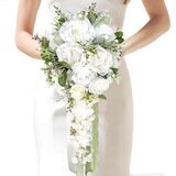 • White Rose Cascading Bouquet: The white and sage green cascading bouquet is made of soft and real touch silk fabric.Silk flowers including white and ivory white rose, dahlia, camellia, lily of the valley, eucalyptus leaves, long ribbons and some other accessories.