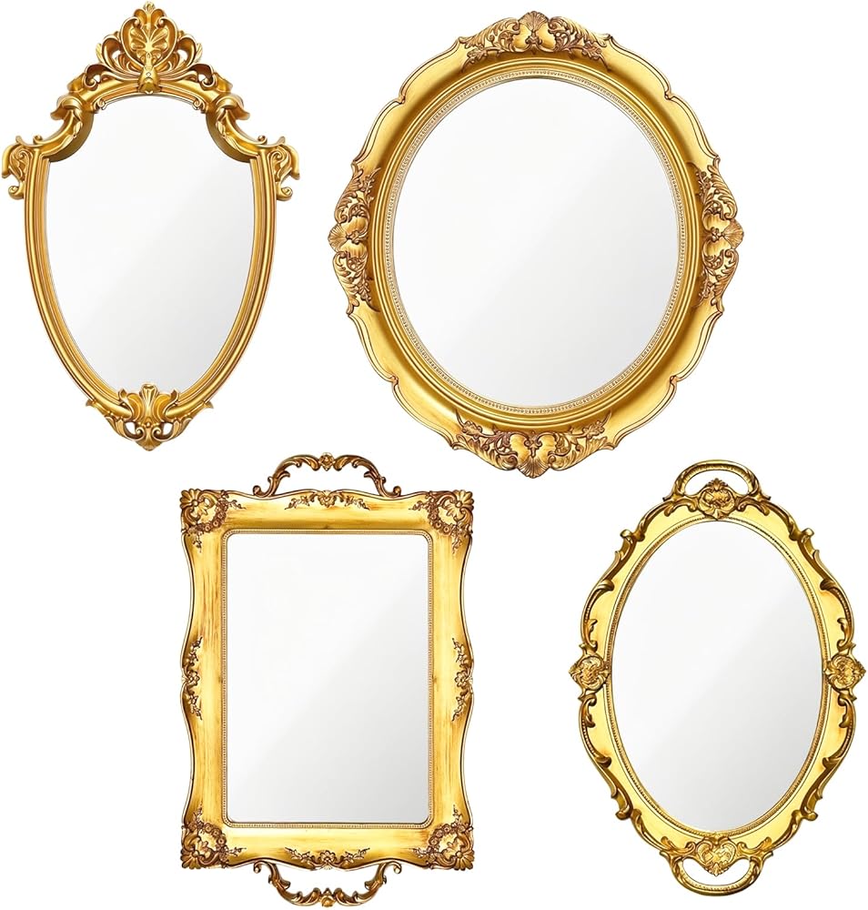 Elevate your space with the 4 PCS vintage gold mirror set—a stunning collection of antique-inspired mirrors designed to infuse elegance and timeless charm into any room. This versatile set features a thoughtful mix of shapes, including shield, square, and oval designs, each adorned with a rich, vintage gold finish that adds a touch of luxury to your decor.