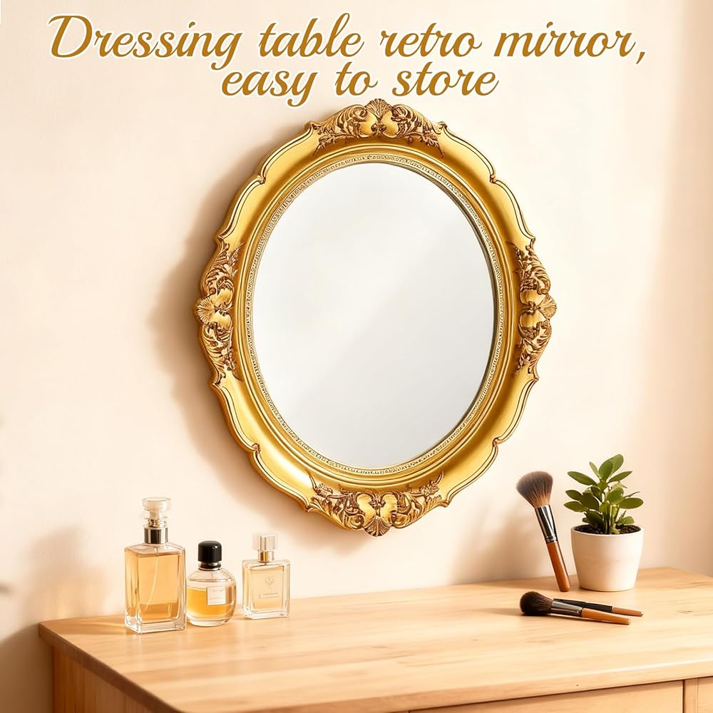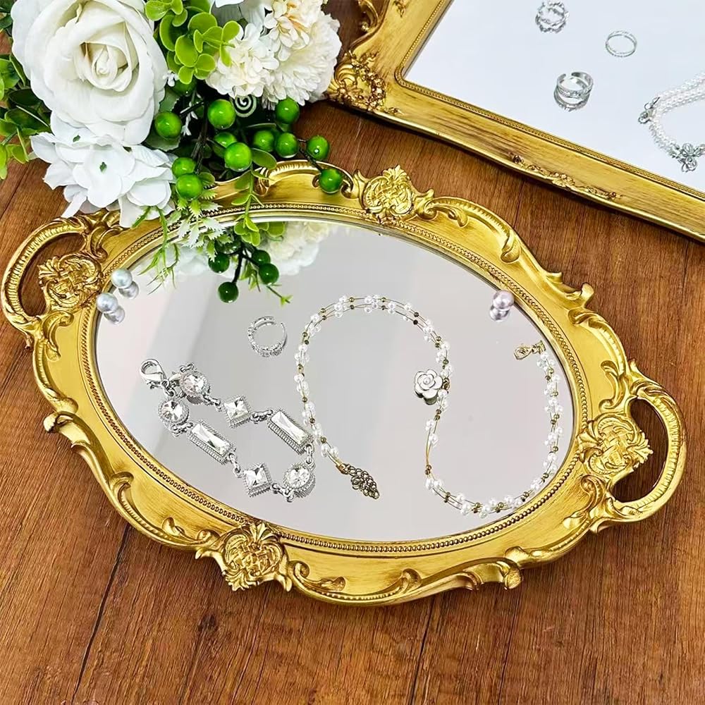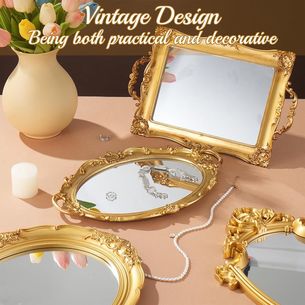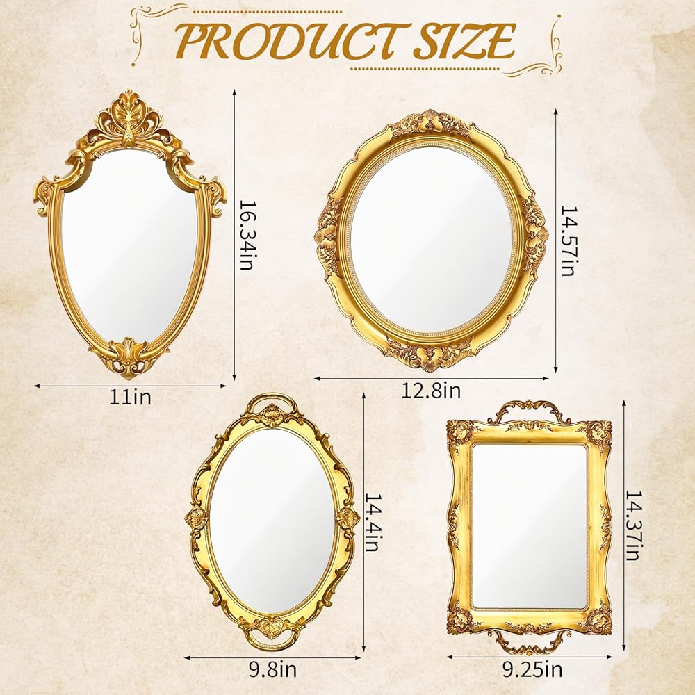 • Ideal Size: The golden shield retro mirror and the gold oval decorative mirror measure 16.34 x 11 inches and 14.57 x 12.8 inches respectively; the square decorative mirror and the retro mirror tray measure 14.37 x 9.25 inches and 14.4 x 9.8 inches respectively.