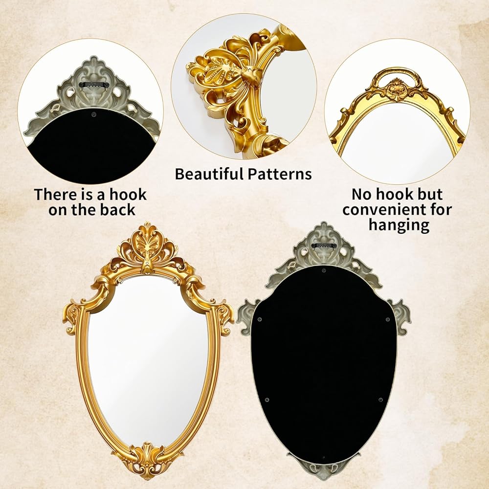 • Retro Style: This gold framed mirror is equipped with a smooth, high-definition mirror surface and a finely crafted frame. It has exquisite craftsmanship and is not easy to fade. It has both practical functions and decorative value, adding a unique retro charm to the space.